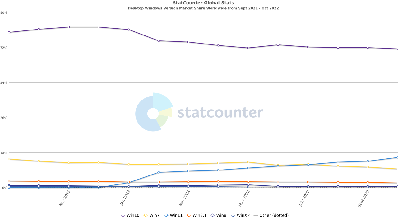 Na získanie prehľadu o používaní systému je tu server StatCounter. Ten na základe svojich meraní ukazuje, že k októbru 2022 klesol trhový podiel Windows 10 z približne 80 % spred roka na 71,26 %. Windows 11 stúpa, ale len veľmi jemne. Jeho podiel je 15,45 %. Systém a jeho rozširovanie je závislé najmä na prechode aktuálnych používateľov Windows 10 a kúpe nových počítačov, kde je Windows 11 už predinštalovaný. Podľa zistení z minulosti sa ukázalo, že odrezanie starého hardvéru od podpory Windows 11 nebude motivačný faktor na kúpu nových zariadení. Nie na to, aby ste na nich mali nový systém.