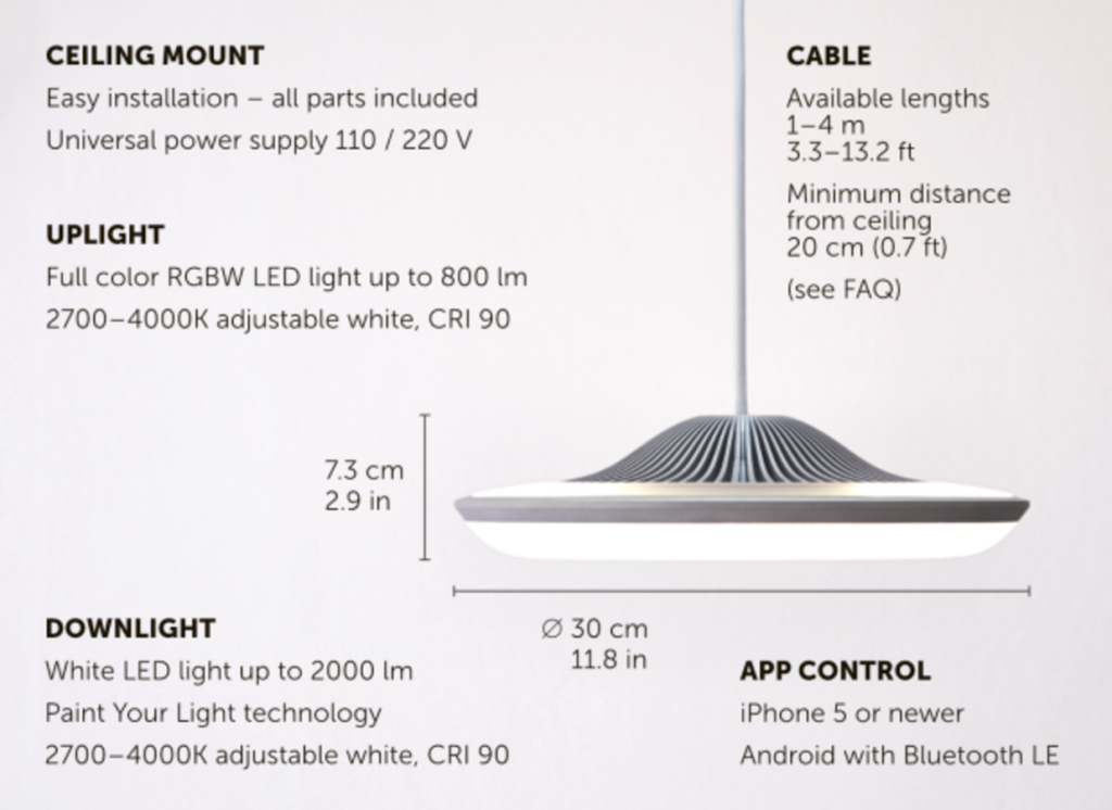 Lampa komunikuje so smartfónom prostredníctvom Bluetooth LE. Výhodou RBG LED diód v lampe je možnosť zmeny farby, presne podľa potreby alebo nálady. Vysoká svietivosť a citlivé nastavenie teploty (min. 2700K / max. 4OOOK – vysoký farebný index až 90 CRI) zaručia dobré osvetlenie za akýchkoľvek podmienok – pre každého. Svetelné scény, farebnú kombináciu a smer svetla si aplikácia/lampa pamätá, pričom sa snaží ich v aktuálnej miestnosti a v aktuálny čas použiť. Učí sa vašim návykom.