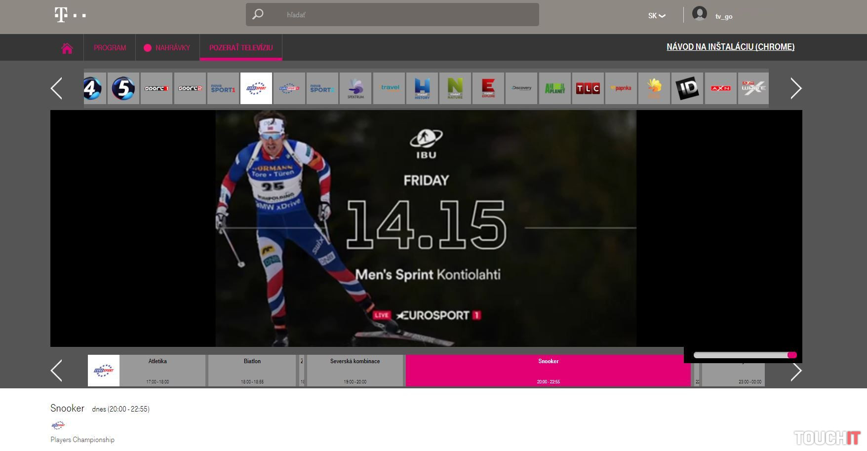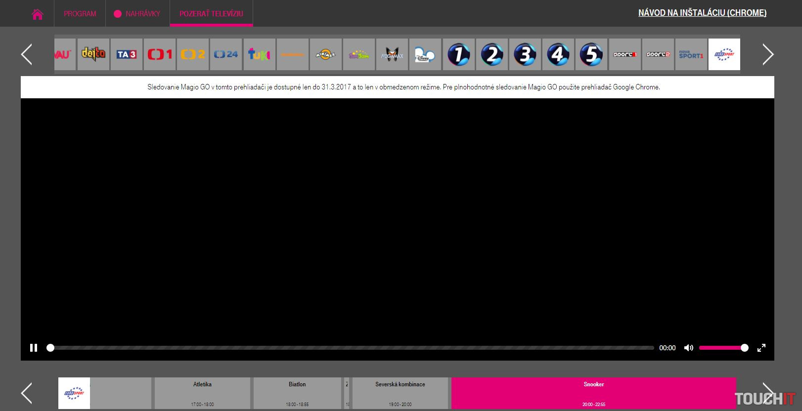 Doplnené: Ak vám po kliknutí na položku Pozerať televíziu ostane v prehliadači čierne okno s hornou lištou TV kanálov, skúste manuálne kliknúť na iný program. Prípadne skúste kliknúť na tento odkaz. Po 1-2 prepnutiach TV kanálov by sa malo korektne spustiť prehrávanie videa a potom sa môžete prepnúť späť na žiadaný kanál.