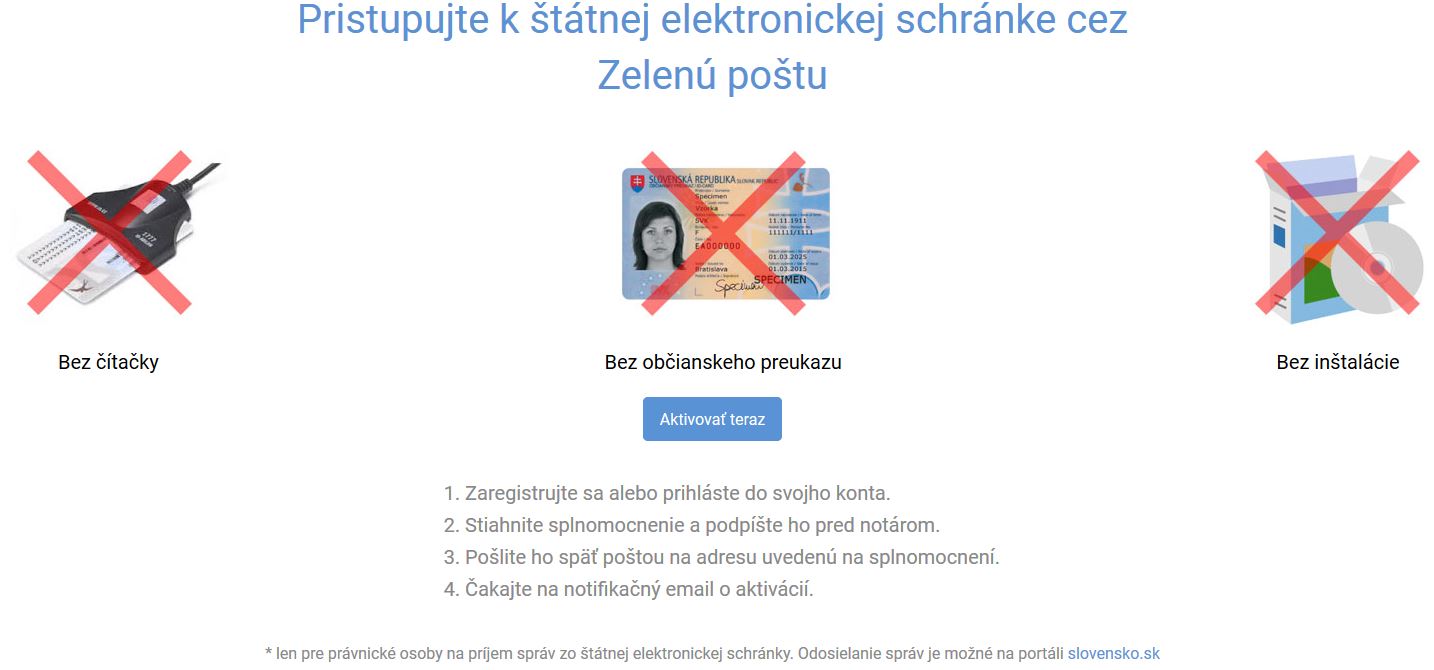 V Zelenej pošte človek nepotrebuje pre prijímanie správ doručených do e-schránky ani jednu z vyššie menovaných vecí. “Musí sa len zaregistrovať na našej stránke a stiahnuť si splnomocnenie, ktoré pred notárom podpíše a pošle späť na adresu Zelenej pošty. Následne obdrží notifikačný email o aktivácii. Potom už bude prijímať správy doručené do štátnej elektronickej schránky do schránky na Zelenej pošte,” prezradil Adrián Csuba.