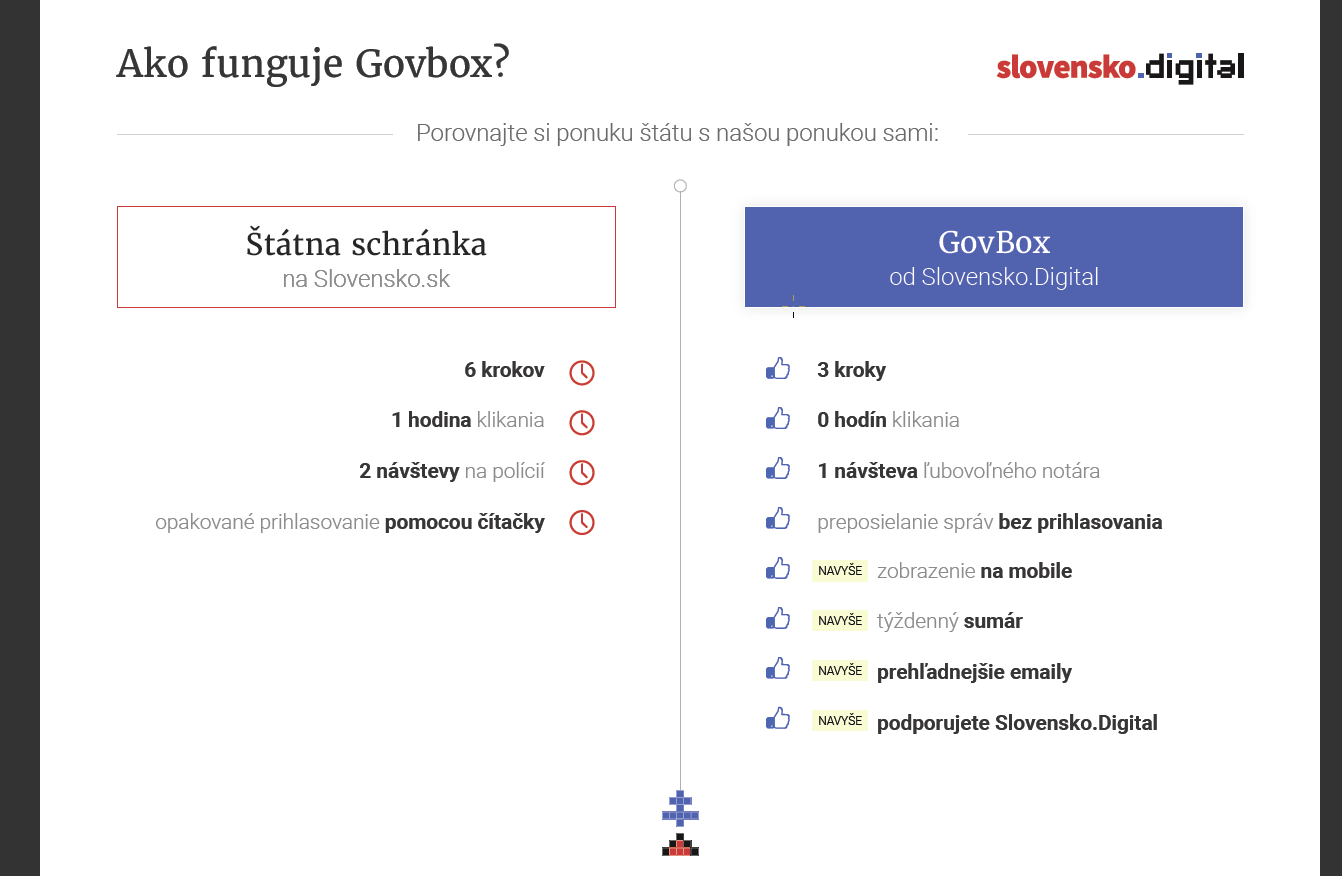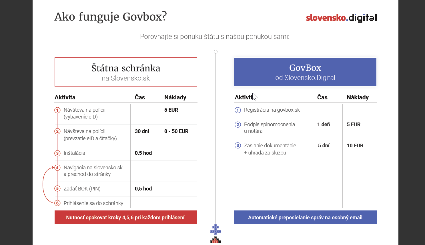 IT odborníci z občianskeho združenia Slovensko.Digital predstavili službu GovBox, pomocou ktorej štatutári dostanú zásielky priamo na email, aj bez elektronického občianskeho preukazu a bez potreby prihlasovať sa na Slovensko.sk. Služba je pokračovaním snahy odborníkov prinášať zjednodušenia pre občanov, tak ako tomu bolo v prípade aplikácie Volby.Digital.