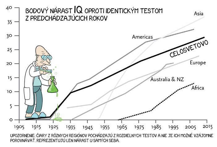 Viete ale, že to nie je pravda? Viete, že priemerná inteligencia ľudí neprestajne a už niekoľko desaťročí po sebe razantne stúpa? Nevie sa pri tom, prečo je to tak, pretože časový horizont, na akom sa to deje, vylučuje evolučný tlak (jedna z možných príčin je nutričné zlepšenie nášho stravovania). Unúval sa vám niekto túto skvelú správu povedať? To, že ľudia sú rok od roku merateľne inteligentnejší?
