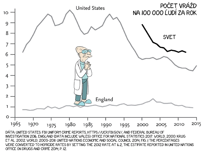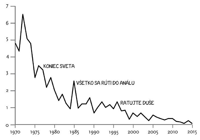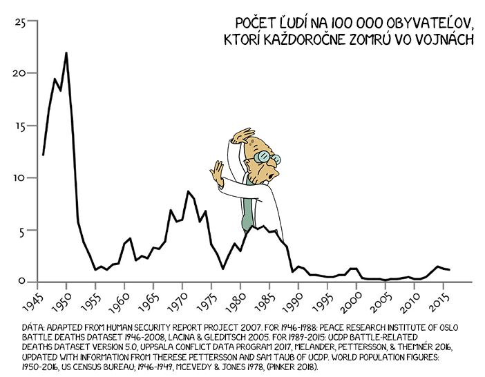 Na túto problematiku dlhodobo upozorňuje práve Steven Pinker, ktorému patril aj predošlý príklad so zubatou krivkou. Pinker je autorom dvoch vyznamných a nesmierne zaujímavých a povzbudzujúcu publikácii, ktoré dokumentujú zlepšovanie sveta a ľudstva v priebehu tisícročí, storočí a takisto posledných dekád. Vrele ich každému odporúčam. Žiaľ, nie sú zatiaľ k dispozícii v slovenskom jazyku.
