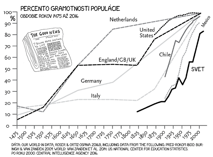 Skutočne celosvetové dobré správy, ako to, že chudoba vo svete dlhodobo rapídne klesá, že úmrtnosť detí sa rapídne blíži k nule, alebo že vzdelanie či IQ populácie je rok od roku lepšie, to je niečo, čo do novín či večerných správ žiaľ akoby nepatrí.