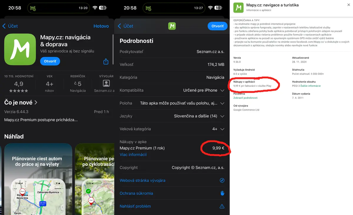 Mapy.cz teraz dostali aktualizáciu iOS aktualizácie na verziu 6.44.3, ktorá síce zatiaľ neumožňuje aktiváciu predplatného, avšak obsahuje informáciu o jeho cene. Prémiové predplatné služby Mapy.cz bude stáť 9,99 eur na rok. Túto cenu si môžete všimnúť v popise mobilných aplikácií pre Android a iOS v obchodoch Google Play a App Store.