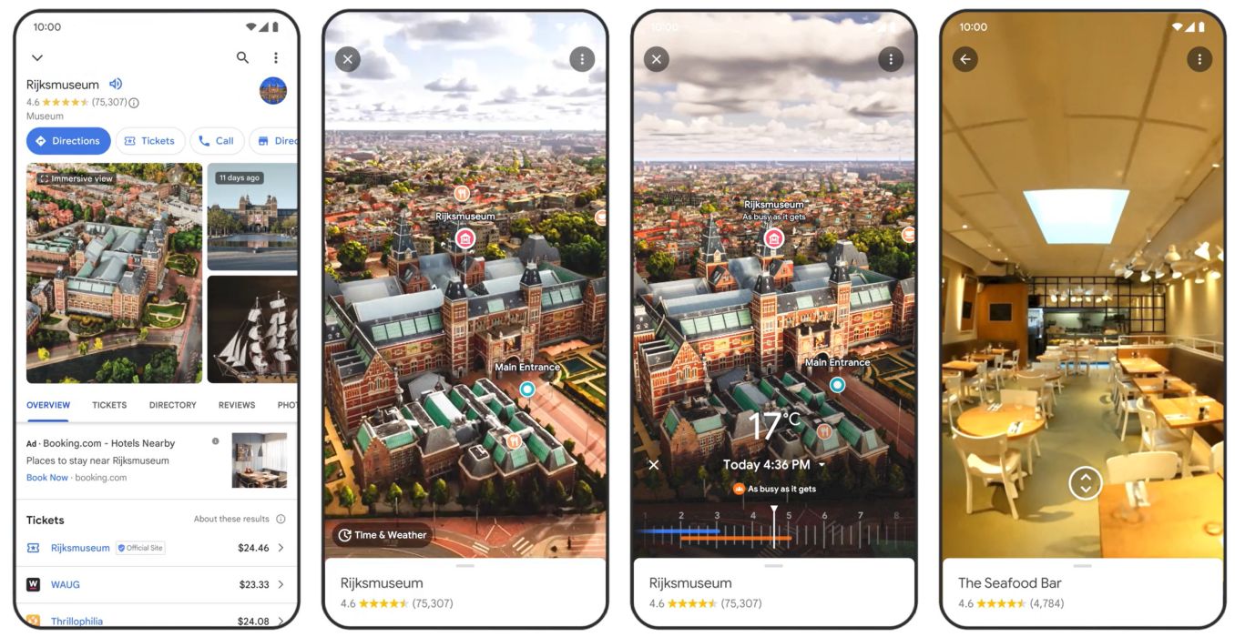 Funkcia Immersive View (podrobné zobrazenie) bola pôvodne predstavená v máji 2022 a predstavuje výborný spôsob, ako preskúmať konkrétne miesto, než sa tam fyzicky vydáte. Funkcia využíva umelú inteligenciu a počítačovú vizualizáciu a spája miliardy záberov zo Street View s leteckými snímkami. Zároveň zobrazuje informácie o počasí, doprave či vyťaženosti daného miesta.