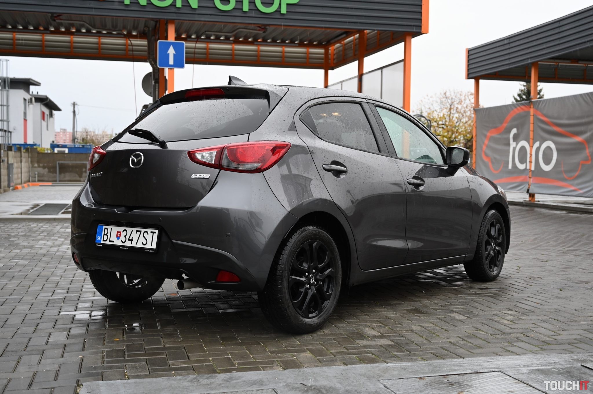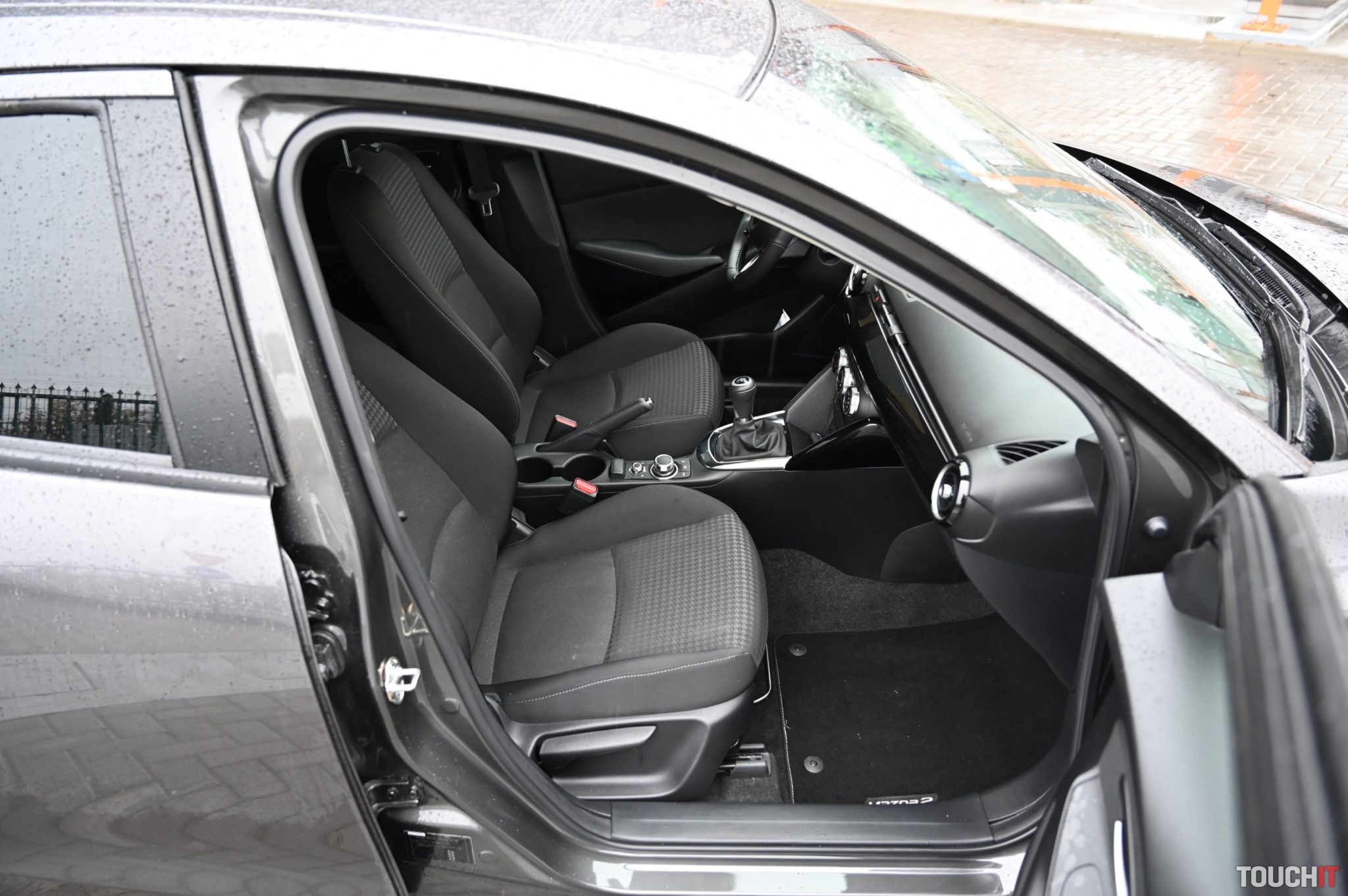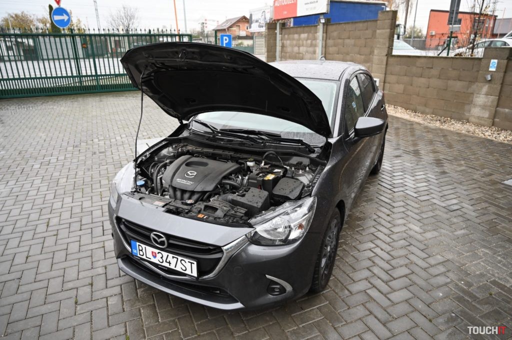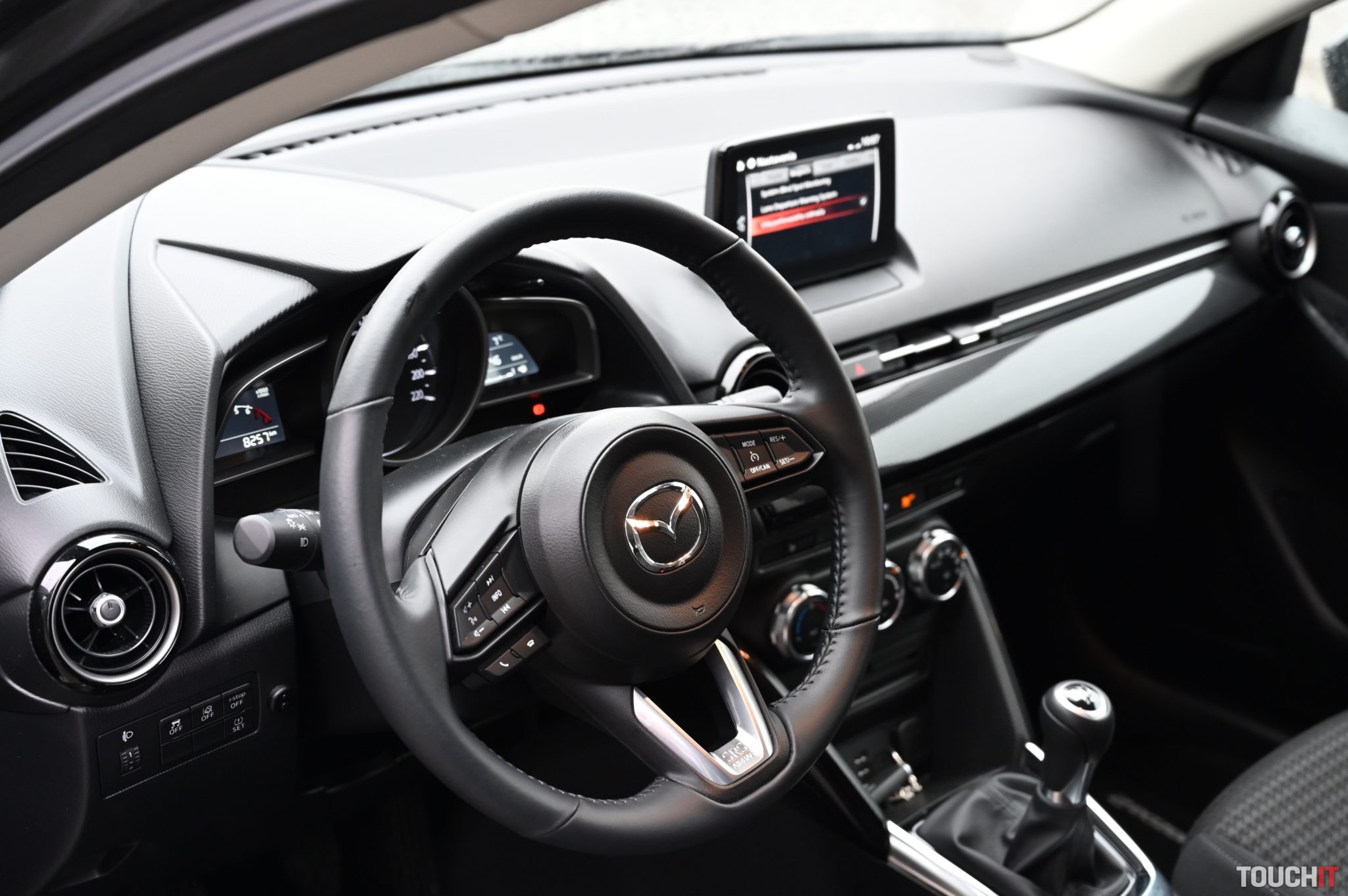 V každom detaile a prelise vidieť dizajnový jazyk automobilky, ktorý je v prípade väčších modelov trošku výraznejší. Tu je implementovaný decentne. Dizajn dvojky je podarený a osobne sa mi celkom pozdáva predok, resp. výrazná chrómová lišta pod maskou chladiča, ktorá opticky prechádza až do svetlometov. Tie sú klasické halogénové, ale svietivosť bola prekvapujúco dostačujúca. LED technológiu využívajú iba hmlové svetlomety. Po dizajnovej stránke vyzerá lepšie model Revolution TOP, ktorý má vo výbave LED svetlomety, vrátane denného LED svietenia. V tomto prípade sú klasické „žiarovkové“ svetlomety aj vzadu. Skrátka, dvojka vyzerá dobre, je pekne spracovaná a z pohľadu celkového vyhotovenia je neutrálna – ani ženská ani mužská. No a celok dotvárajú pekné 16“ hliníkové disky (185/60/R16). S ľahkosťou sa presuňme dnu, kde je prekvapivo dostatok miesta a pohodlie aj pre 2 metrového šoféra. Vpredu je to z pohľadu priestoru úplne v poriadku. Látkové sedadlá sú pohodlné, dobre sa tu „pracuje“ a polohu som si našiel tiež celkom rýchlo. Ovládacie prvky sú jemne orientované na vodiča a všetko je na dosah ruky. Bodaj by aj nie, až také veľké to vo vnútri nie je J. Osobne mi trošku chýbala lakťová opierka, ktorá by sa sem určite zmestila. Ešte dodám, že po prejdení viac ako 200 km som vysadol celkom v pohode, bez bolestí :). Celkové vyhotovenie interiéru je z pohľadu materiálov a spracovania na veľmi dobrej úrovni, čo si zaslúži pochvalu. Ani zadní pasažieri sa nebudú sťažovať, ale záleží od ich proporcií. Ideálne, ak to budú deti alebo útlejšie postavy. Pre 4 a už vôbec nie 5 chlapov to nie je, pochopiteľne. Priestor vzadu je primeraný proporciám auta, povedal by som, že až nadpriemerný. Samozrejmosťou sú aj ISO-Fix kotviace body. Posun o ďalšiu pozíciu znamená kufor, ktorý má v základe 250 litrov. Po sklopení zadných operadiel (delenie 60:40) to bude 882 litrov. Celkom fajn, ale iba na menšie nákupy a predmety. Ale áno, ja som sem vopchal aj väčší kočík, táto disciplína musí byť, takže mamičky sú „safe“. Treba nájsť správnu cestu, ale ide to. Motor, prevodovka a podvozok Malú Mazdu poháňa benzínový 4-valec (atmosférický) s výkonom 66 kW (90 ps) a max. krútiacim momentom 148 Nm. Motor je spriahnutý s 5-stupňovou manuálnov prevodovkou. Táto kombinácia je veľmi fajn, a to aj napriek tomu, že tie čísla nie sú veľké. Základom je, že ide o 4-valec, ktorý niečo vydrží a má príjemnejší zvuk ako 3-valce. Výkonu je dostatok tiež, o to sa báť netreba. S dvojkou sa dá aj zabaviť, veľmi pekne ide „po plyne“ a zákrut sa tiež nebojí. Nie je to pretekár, ale v rámci bezpečnosti je dobré vedieť, že ide o stabilné auto, ktoré sa pri prudšom manévri neroztrasie.