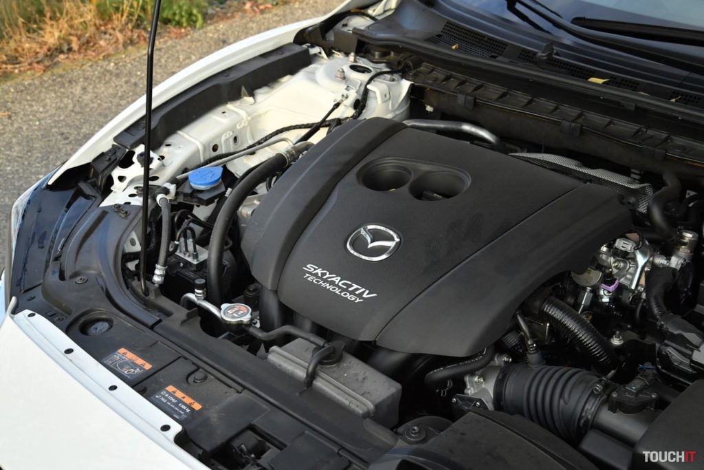 Pod veľkou prednou kapotou má svoje miesto vrcholová benzínová motorizácia s označením 2.5 Skyactive-G. To napovedá, že ide o 2,5-litrový benzínový 4-valec (Atmosférický – bez turba), ktorý má výkon 143 kW (193 hp) a max. krútiaci moment 258 Nm (škoda, že na náš trh Mazda nedotiahla aj preplňovanú verziu s výkonom 186 kW). Tento motor spolupracuje so 6-stupňovou automatickou prevodovkou (+ radenie pod volantom). Síce je iba 6-stupňová, ale výborne vyladená a pracuje bez akýchkoľvek zaváhaní alebo problémov.