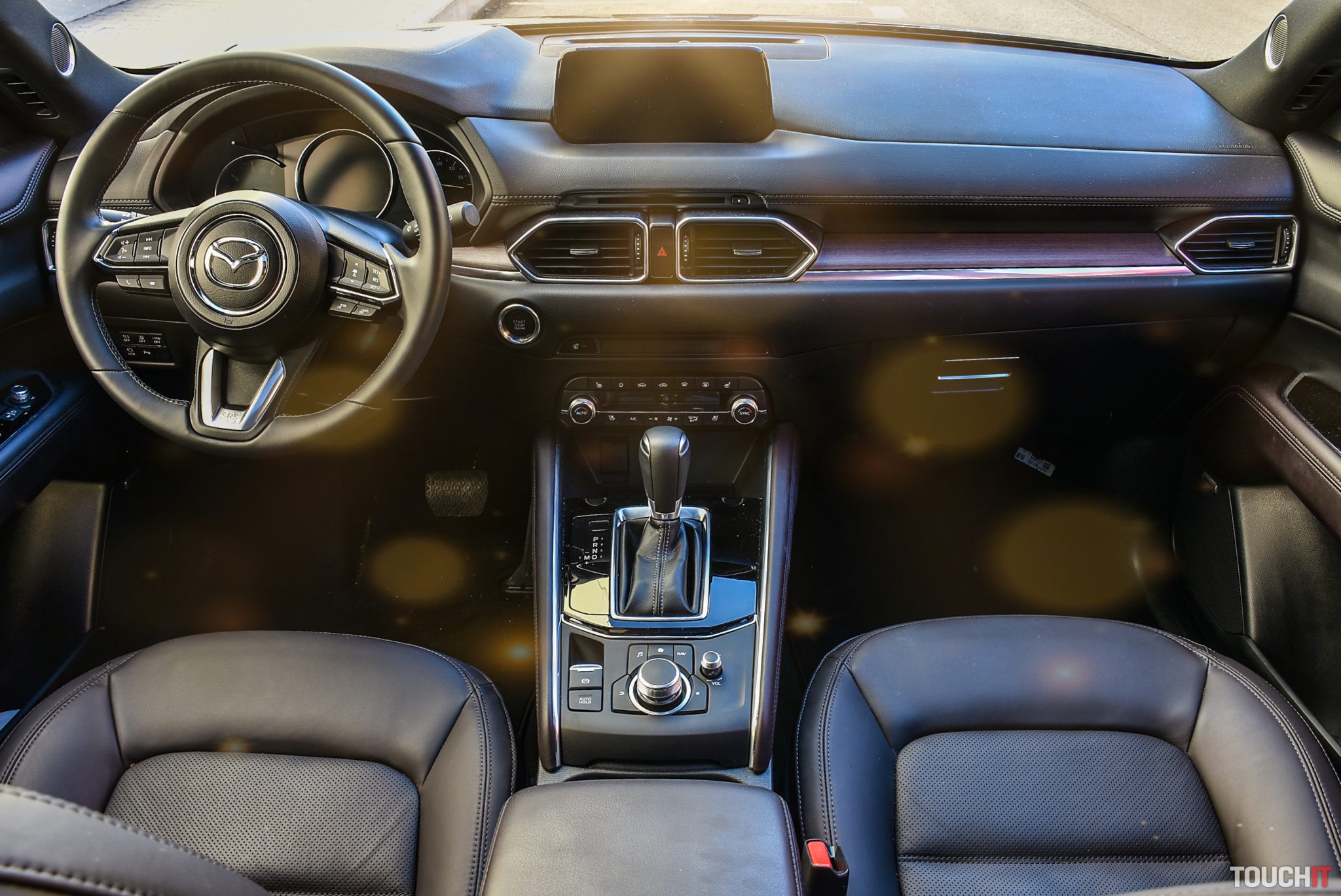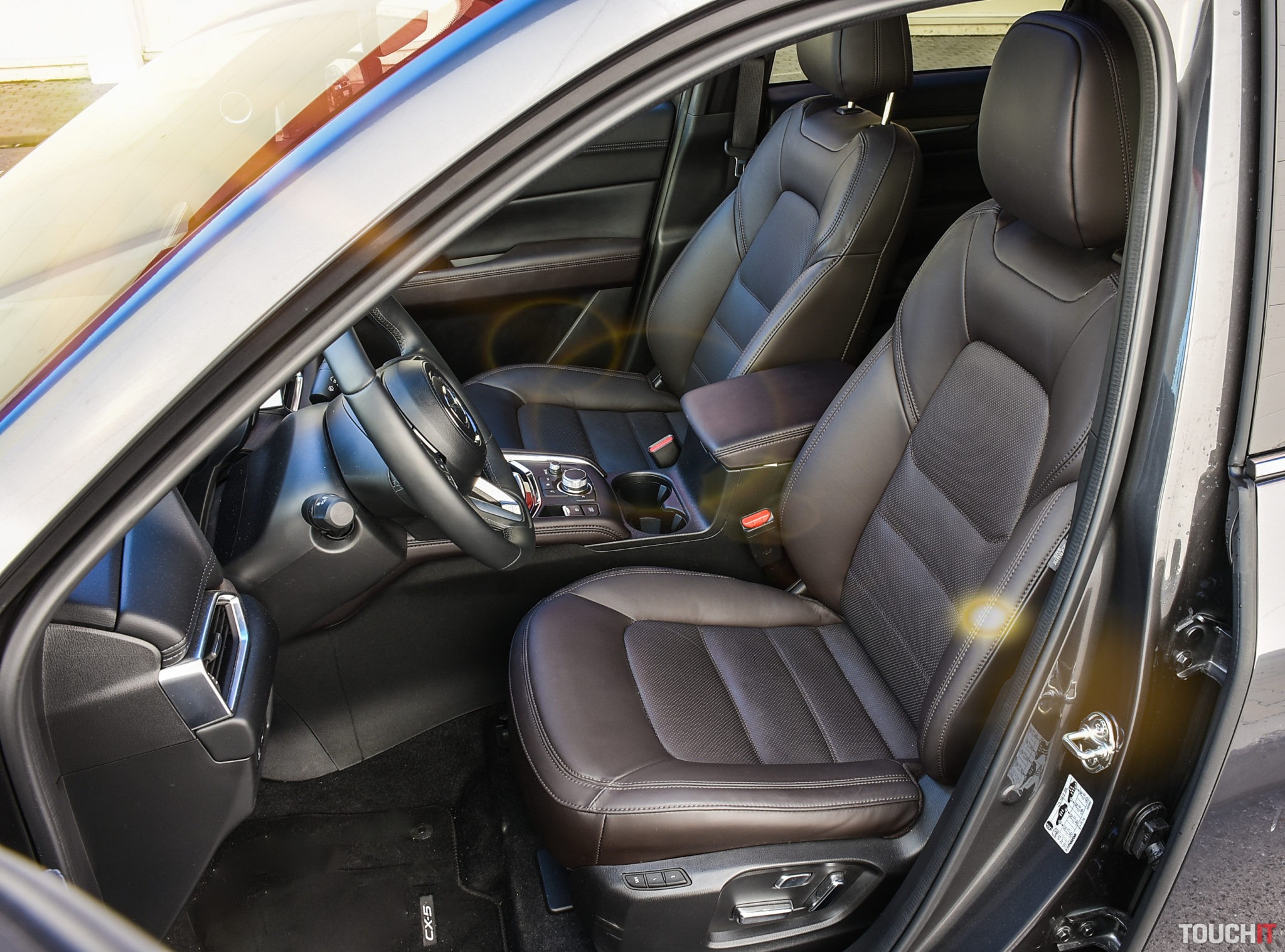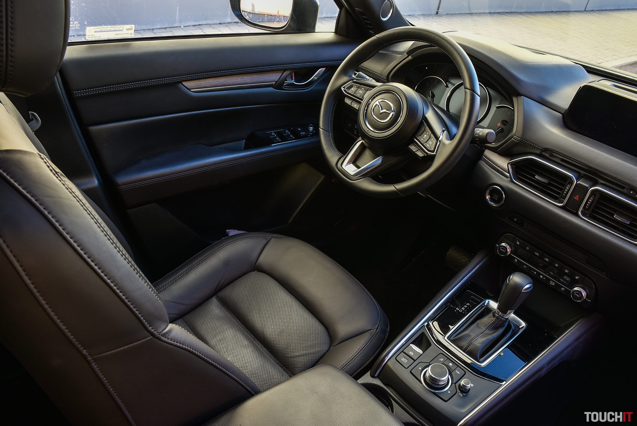 Mazda CX-5 (resp. Mazda všeobecne – od modelu 3 vyššie) ponúka kvalitné materiály a precízne spracovanie interiéru, ktoré pôsobí podstatne prémiovejšie ako v rovnocennej konkurencii. V interiéri nič nevŕzga, všetko sedí ako má a celkové spracovanie pripomína o level vyšší model. V tomto sa mi (nie len) CX-5 vždy páčila. V interiéri prevláda kvalitná koža, drevený obklad a leštený hliník, čo je zárukou decentnej elegancie. No nie je to iba o materiáloch. Japonskí dizajnéri vedia celý interiér veľmi pekne vyskladať, čoho výsledkom je výborný posed, aj vďaka maximálne pohodlným kreslám, slušný výhľad z kabíny a všetky ovládacie prvky na dosah ruky. Cením aj nekonfliktne zakomponovaný centrálny LCD displej „infotejmentu“, ktorý sa dá ovládať dotykom (iba ak auto stojí) alebo kruhovým ovládačom v širokej stredovej konzole.