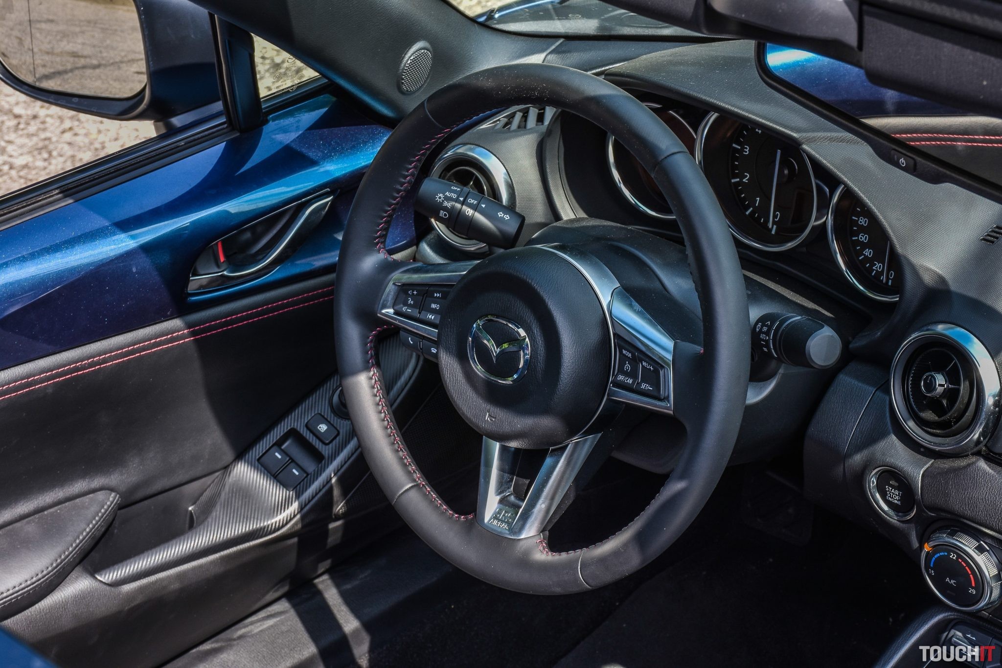 Pracovisko vodiča dopĺňa multifunkčný a nastaviteľný volant, ktorý dobre sadne do rúk, ale mohol byť trošku viac odlišný – športovejší. Klasikou sú tri kruhy v zornom poli vodiča – dva analógové budíky (otáčkomer/rýchlomer) a jeden kruhový displej zobrazujúci informácie o stave vozidla a jeho systémoch. Zo stredu palubnej dosky vytŕča 7“ dotykový displej multimediálno-informačného systému Mazda Connect. Tento systém je možné ovládať prostredníctvom dotyku alebo ovládača v stredovej konzole, kde sa už klasicky nachádza aj potenciometer na úpravu hlasitosti.