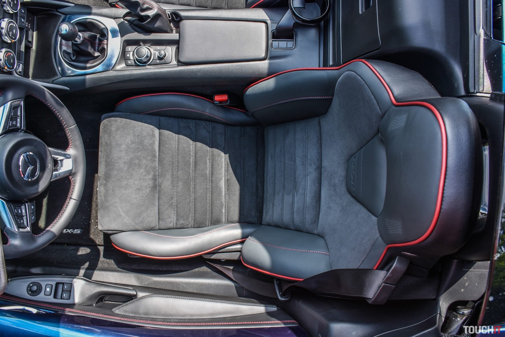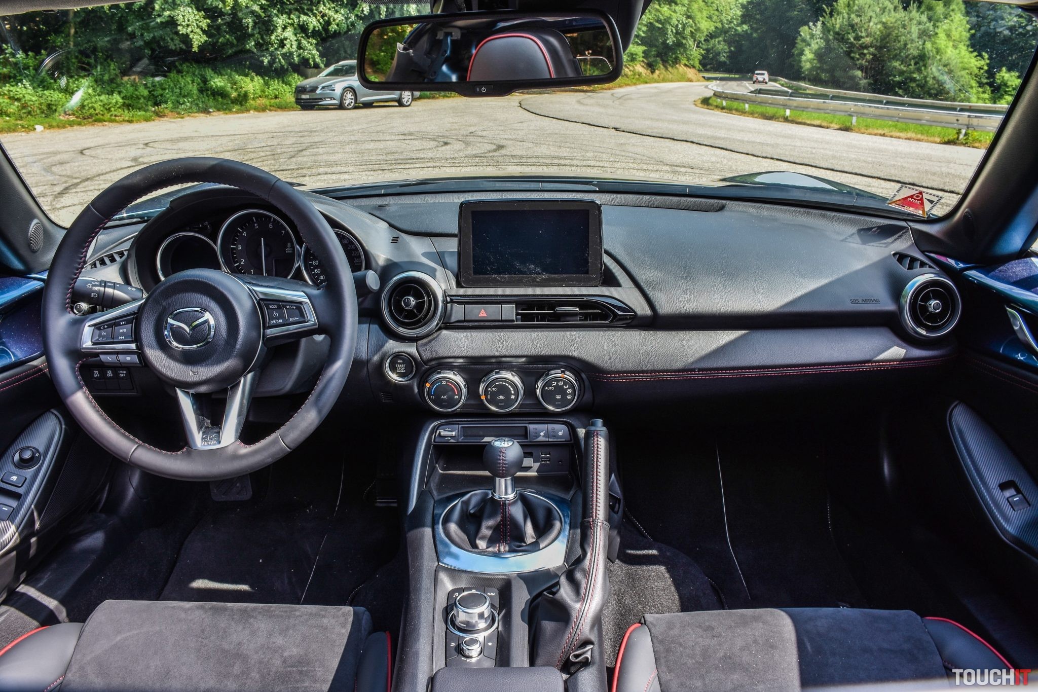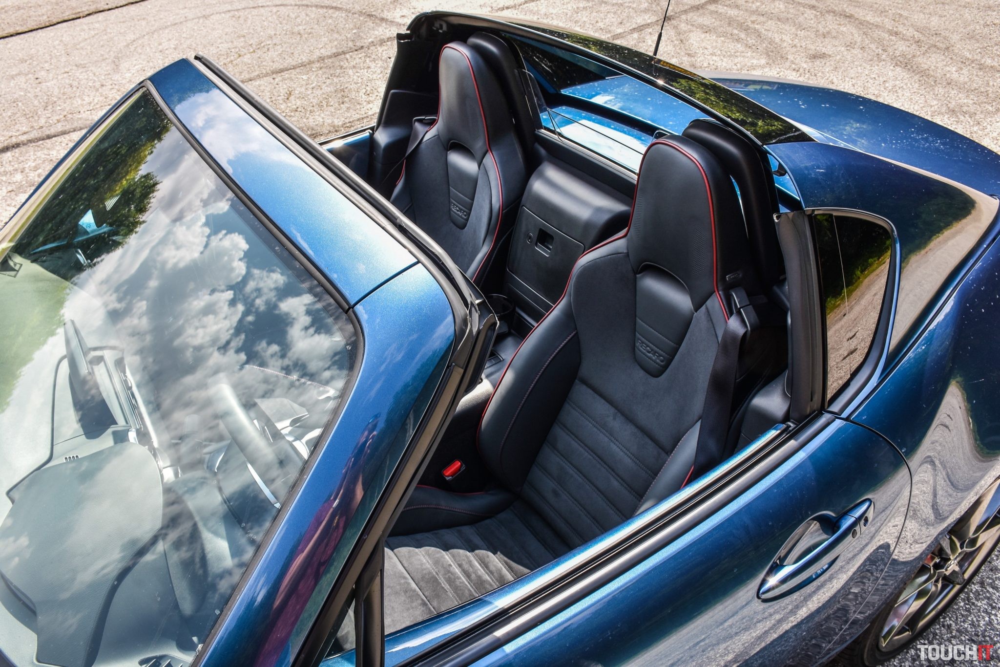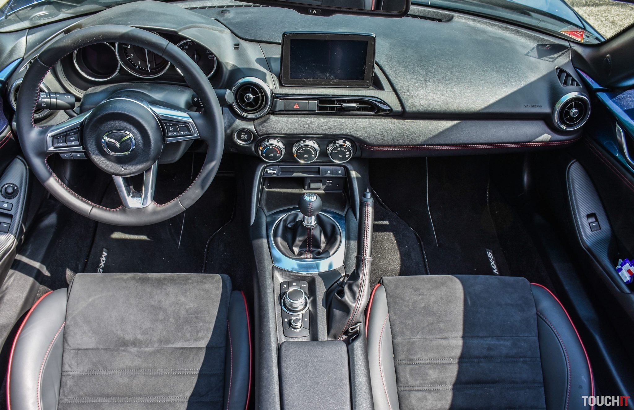 Interiér Mazdy MX-5 je jednoduchý, minimalistický a dobre usporiadaný. Nevýhodou (pre mňa) je iba to, že ide o strašne malé auto, a tak je pochopiteľne aj životný priestor obmedzený. Testovaný model mal výborné športové sedadlá značky RECARO, ktoré sú manuálne nastaviteľné v základom rozsahu + sú vyhrievané. Ja meriam 2 metre, takže možnosť nastavenia sa zúžila na minimum a môj chrbát cítil každú časť sedadla. Jednoducho to je auto pre menšie osoby, skúšali si sem sadnúť viacerí ľudia, pričom som sa utvrdil, že ideálne je to do max. 180 cm. Ak máte viac, tak smola – hlava vám bude trošku trčať von, čo je smiešne a ešte aj nebezpečné. Po zavretí strechy som sa musel poskladať ešte viac a krk dať o 10° doprava, aby som bol v „pohode“. Každopádne musím príplatkové športové sedadlá pochváliť, nakoľko sú kvalitne spracované a majú optimálne bočné vedenie s integrovanou hlavovou opierkou.