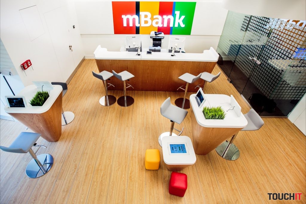 Ďalšou aktivitou mBank je budovanie kamenných pobočiek . Zaujme už vstupná prezentácia nových produktov vo výklade. Všade sú interaktívne obrazovky a môžete tu hovoriť aj s reálnym človekom. V pobočke tiež nájdete bankomaty a pripravená je aj zábava pre deti a tiež sa tu dá realizovať aj videokonferencia s expertom.