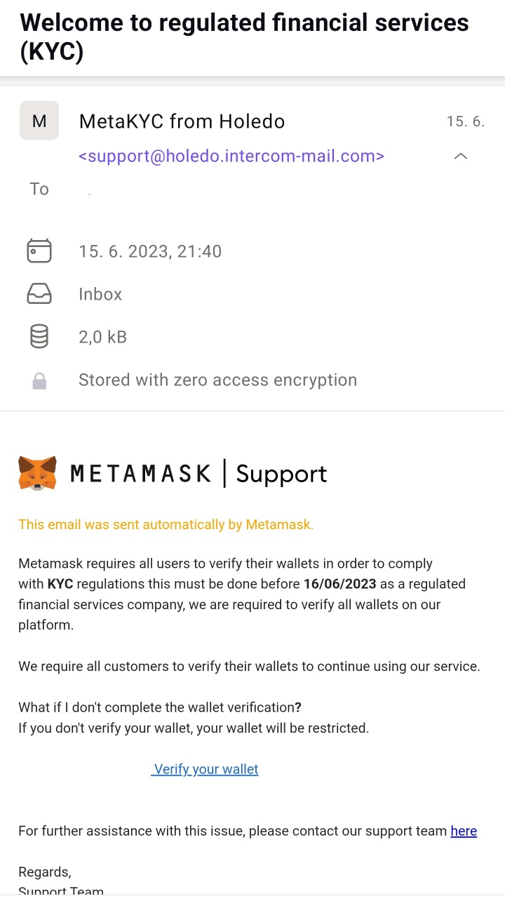 Ide o jeden z lepšie vymyslených podvodov, no pozornému oku neunikne doména, ktorá nesúhlasí so spomenutou peňaženkou. Podvodníci využili časový nátlak, nakoľko správa nám bola doručená len jeden deň vopred. V nej sa uvádzalo, že je potrebné postúpiť takzvané KYC – Know your customer a to do 16. júna 2023. V opačnom prípade ju nebude možné plnohodnotne používať. To mohlo mnohých používateľov vystrašiť, nakoľko by to pre nich mohlo znamenať, že do overenia nebudú môcť na peňaženku posielať žiadne kryptomeny ani z peňaženky robiť žiadne transakcie smerom von.