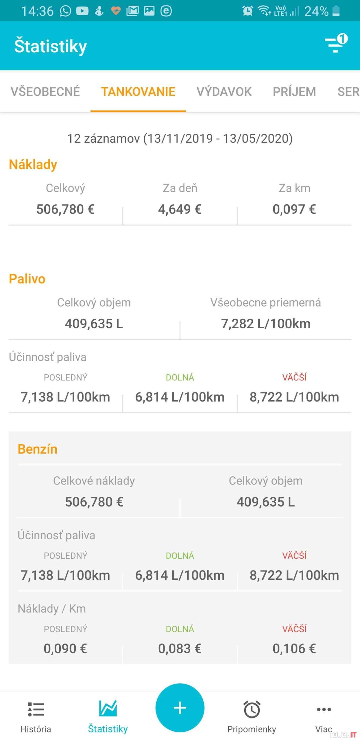 V prvom rade ma zaujímalo, koľko asi miniem peňazí na benzín za mesiac respektíve rok. Zaregistroval som sa a začal aplikáciu používať. V aplikácii si jednoducho pridáte hocijaký záznam s dátumom, časom, stavom tachometra, druhom paliva, ceny za liter a celkovej ceny, či množstva. Ideálne je, že ak využívate rôzne zľavy, tak aplikácia vie prerátať cenu na liter. Dá sa vybrať aj čerpacia stanica a preto jednoducho viete zistiť, kde ste čerpali ak nebolo niečo v poriadku alebo naopak, kde ste boli spokojní. Takéto možnosti sú aj pri zadávaní servisných úkonov, kde máte tiež množstvo predpripravených možností, prípadne si môžete pridať aj vlastné.Prehľadná štatistika