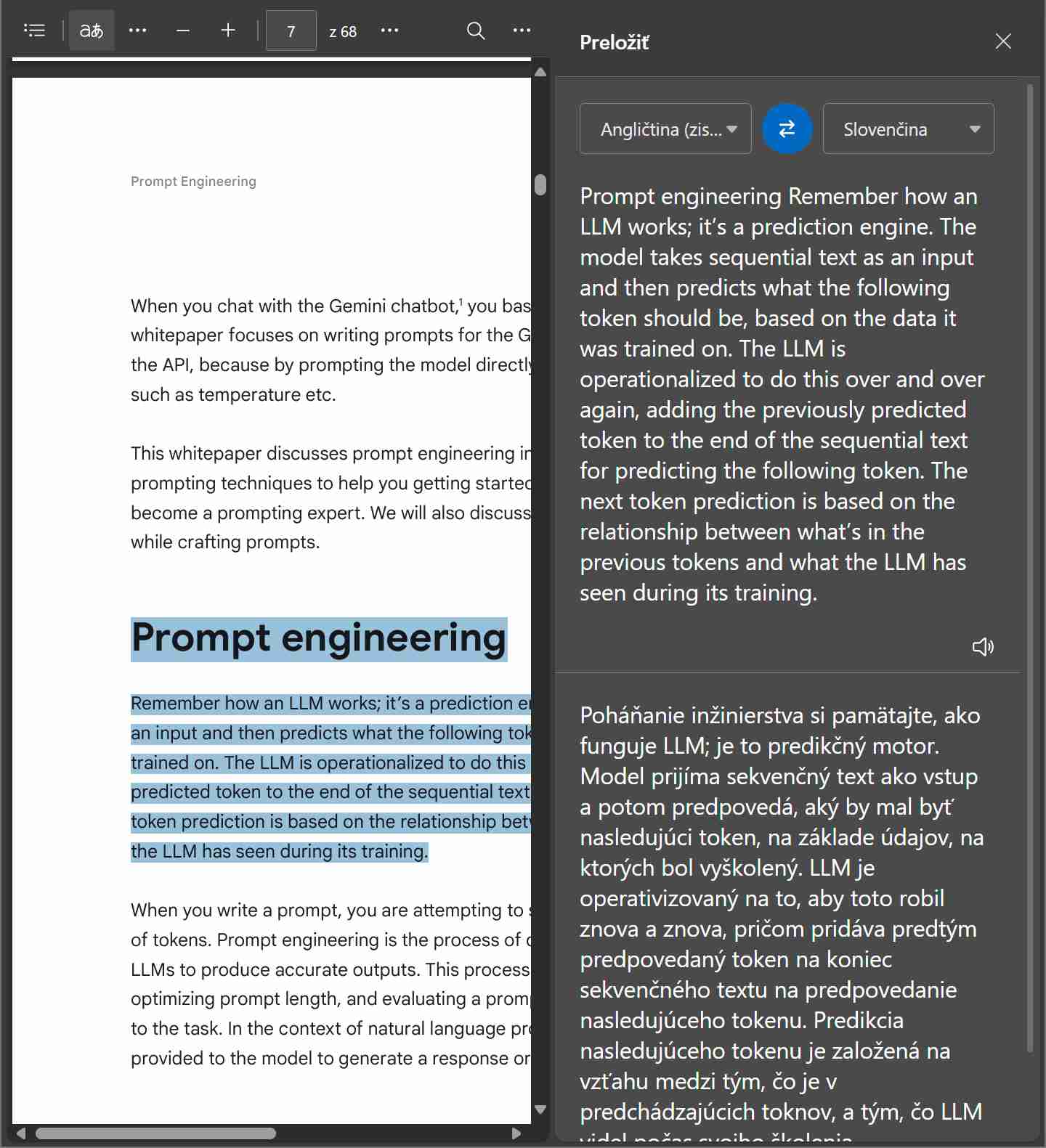 Funguje preklad aj do slovenčiny a ide o doteraz dlhšie dostupnú funkciu postupného prekladu. Toto riešenie je pohodlnejšie ako kopírovanie textov mimo otvorenú kartu so zobrazeným dokumentom.