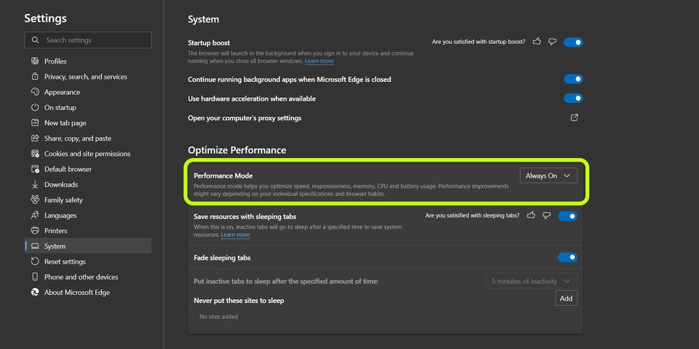 Microsoft sa však pokúša ešte viac zlepšiť využitie procesora, pamäte RAM a batérie. V rámci Canary vydania svojho prehliadača testuje nový režim s názvom „Performance mode„. Prehliadač v tomto režime nejde na plný výkon, ako by sa mohlo podľa názvu zdať, avšak optimalizuje dostupné prostriedky počítača v maximálnej možnej miere. Na novinku upozornil portál 9to5google.