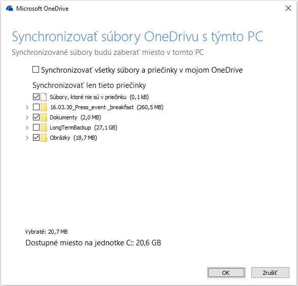 Nastavenie, ktoré priečinky sa majú synchronizovať
