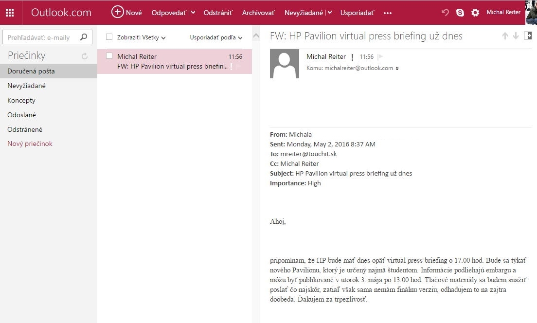 Poštový klient Outlook.com, ktorý má v ponuke nástrojov označenie Mail, nahradil už pred niekoľkými rokmi klienta Hotmail. Po zadaní adresy www.hotmail.com sa zobrazí nové rozhranie Outlook.com. Klient má unifikované rozhranie s ostatnými službami a veľmi sa podobá na klienta Mail či v lokalizovaných verziách aplikácie s názvom Pošta. Toto chválime a Microsoft ponúka používateľom jednotné prostredie, či už použijú dlaždicovú alebo on-line verziu aplikácie.
