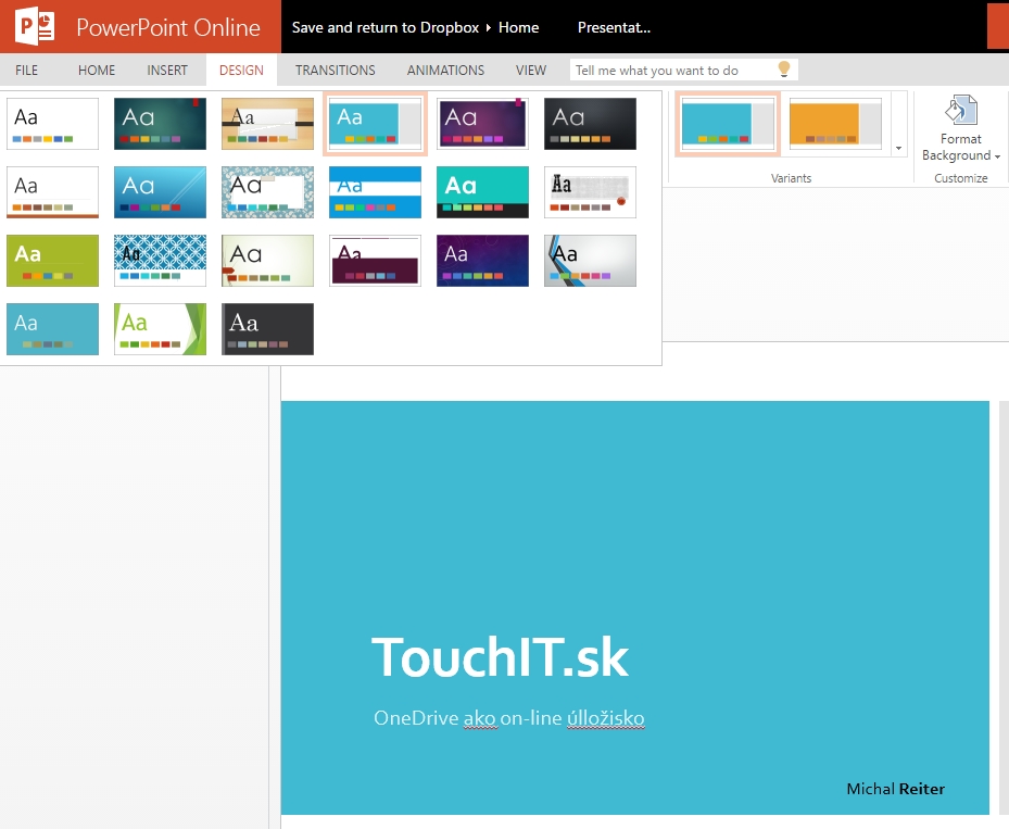 Táto aplikácia takisto vychádza z princípu zvyšných dvoch predstavených. To znamená, že máte k dispozícii otváranie súborov prezentácií z počítača prenesených na OneDrive. No úpravy sú v menšom rozsahu. Opäť ale platí, že základnú prezentáciu s vloženými objektmi pripravíte aj cez webové rozhranie. K dispozícii je formátovanie textu, úprava vzhľadu snímok ale vkladanie tvarov. Dokonca aj ich úprava je na slušnej úrovni a môžete ich výsledný vzhľad jemne modifikovať. Nebude to síce na úrovni profi grafického editora, no dá sa s tým pracovať. Tiež nás potešila možnosť meniť celkovú tému. Animácií objektov a prechodov medzi snímkami je pomenej, no stále dokážete priamo na webe vytvoriť animované prezentácie. Pri usporadúvaní objektov na snímke vám pomôžu vodiace čiary, presne ako vo verzii pre počítač.