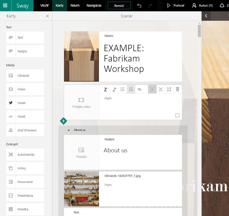 Prezentácie, ktoré prilietajú a efektne sa menia počas nových snímok, pochádzajú práve z novej aplikácie Sway. Môžete použiť PowerPoint tak ako doteraz, nie je to náhrada za tento program. Sway je on-line nástroj, kde všetko, čo vytvoríte zostáva v cloude. Obsah sa teda nedá exportovať do nejakého formátu. Prostredie je vynikajúce a vždy sa vám prispôsobí podľa toho, na akom zariadení alebo displeji aplikáciu použijete. K dispozícii máte vkladanie textov, nadpisov, obrázkov, videí ale aj vnorenie tweetov či iných fragmentov webového kódu. Objekty sa dajú zoskupovať a vrstviť.