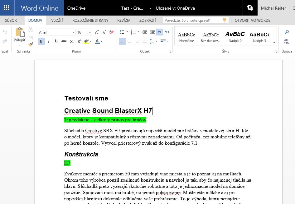 Po spustení dokumentu máte síce jednoduchšie, no stále dobré možnosti ako pracovať s obsahom. Dokonca aj na nami vytvárané články vystačíme s touto verziou. Máme tu široké možnosti formátovania textu vrátane možnosti vkladania ďalšieho obsahu. Ide napríklad o obrázky, tabuľky, prepojenia ale aj komentáre. Isté limity potom nájdete v prípade spracovania rozsiahlych dokumentov. Napríklad môžete vložiť zlom strany, no nepočítajte s pokročilým číslovaním strán podľa sekcií dokumentu. To už je pokročilejší úkon a bude treba použiť desktopovú verziu aplikácie. Napríklad na to, aby ste očíslovali dokument podľa párnych alebo nepárnych strán, prípadne iné číslo na prvej strane, môžete použiť on-line verziu. Na dokumente môžete pracovať viacerí a zobrazovať si komentáre ako aj históriu úloh.