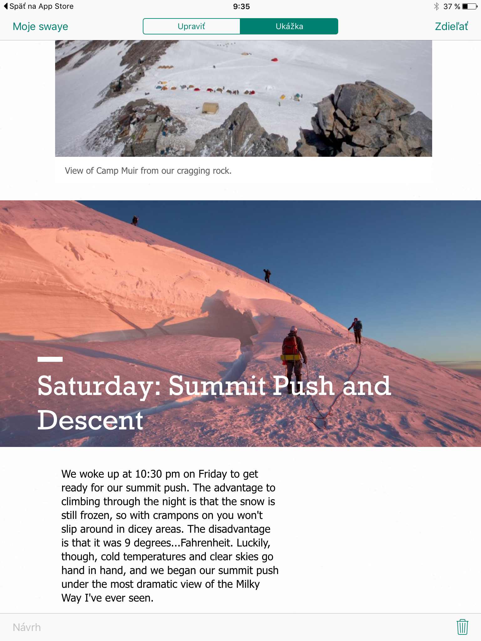Za zmienku stojí, že do Swayu môžete priamo vložiť tweety, ale aj tzv. „vkladací kód“. Vďaka tomu si do svojho výtvoru môžete vložiť napr. interaktívnu mapu z inej webovej stránky alebo priamo cudzie multimédiá či grafy. Časť s názvom Zoskupiť využijete napr. pri vložení viacerých fotografií. Môžete vytvoriť galériu s rôznymi dizajnami. Nám sa páči voľba Porovnanie. Tá zoskupí dve fotky, ktoré sa prekrývajú a vy si určujete zobrazovanú časť každej fotky posuvníkom. Je to výborné, keď napr. porovnávate dve veľmi podobné fotografie, odfotené rôznymi smartfónmi. Alebo keď chcete poukázať na to, ako sa zmenila časť mesta počas 10 rokov. Za predpokladu, že máte potrebné fotografie k dispozícii. Stredná časť obrazovky sa nazýva Scenár a ide o nástroj, ktorým budete jednoducho upravovať výslednú podobu vášho výtvoru. Totiž, texty, multimédiá, galérie, to všetko sú samostatné prvky, ktoré môžete podľa potreby prehadzovať medzi sebou. Zmeny môžete v reálnom čase sledovať v pravej časti obrazovky, kde sa nachádza sekcia Ukážka. Kedykoľvek si môžete výtvor pozrieť aj vo finálnej podobe, stačí použiť tlačidlo Prehrať v pravej hornej časti.