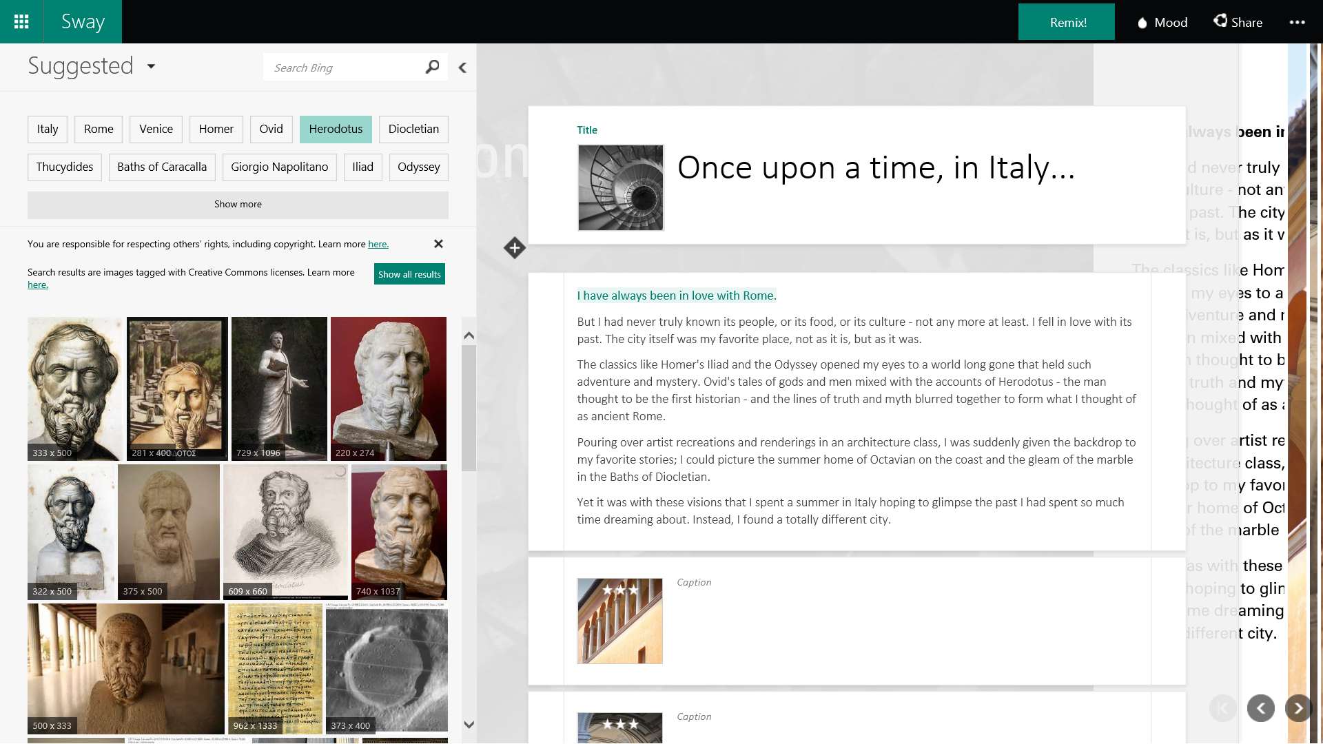 Na Swayi oceňujeme viacero zdrojov obsahu, z ktorých môžete priamo čerpať. Tieto funkcie sa objavili aj v nástrojoch balíka Office 2016, Sway však ponúka viac zdrojov. K dispozícii je úložisko OneDrive a služby Facebook, OneNote, Flickr, YouTube a Twitter. Microsoft zvažuje integráciu ďalších služieb a cloudových úložísk. Priamo z rozhrania aplikácie môžete vyhľadávať obrázky cez Bing. V zozname sa zobrazí aj rozlíšenie snímky. Google zatiaľ v ponuke chýba, čo neprekvapuje. Každopádne, integráciu týchto služieb chválime, uľahčuje tvorbu obsahu. A pokiaľ nenájdete, čo potrebujete, vždy môžete použiť Google a ďalšie služby mimo rozhrania aplikácie a do Swayu si multimédiá manuálne importovať. Vkladanie z ostatných služieb nájdete v ponuke Vložiť, nový stĺpec sa zobrazí v ľavej časti. Rovnako je k dispozícii položka Návrh. Môžete meniť font písma, paletu farieb atď. Položka Navigácia prispôsobí spôsob „listovania“. K dispozícii je zvislé posúvanie, čo pripomína čítanie článku alebo prepínanie medzi „slajdami“. Poslednou ponukou je vodorovné posúvanie, čo je hybrid medzi prezentáciou a listovaním. V ponuke si môžete všimnúť tlačidlo Remix!. To náhodne zmení štýl vášho Swayu z ponuky návrhov. Toľko základné funkcie a možnosti aplikácie. Sway nevyžaduje veľké znalosti, nástroj je nenáročný na používanie. Chvíľu sa s ním budete zoznamovať, ale po pár pokusoch dokážete vytvárať efektívne prezentácie, články a ďalší obsah. Za zmienku stojí, že vytvorený Sway môžete zdieľať s celým svetom alebo iba vybranými používateľmi. Takisto môžete pozvať ostatných používateľov, aby sa podieľali na tvorbe vášho obsahu. Spolupráca funguje jednoducho, druhému používateľovi stačí poslať špeciálny odkaz, ktorý obsahuje aj právomoci na upravovanie.