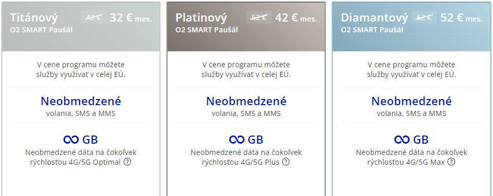 Neobmedzené dáta v Smart paušáloch sú skutočne neobmedzené, avšak je medzi nimi rozdiel. V ponuke je Titánový, Platinový a Diamantový O2 SMART Paušál. Tie skutočne nemusíte ani po minutí dát plnou rýchlosťou nikdy navyšovať. Čo to znamená?