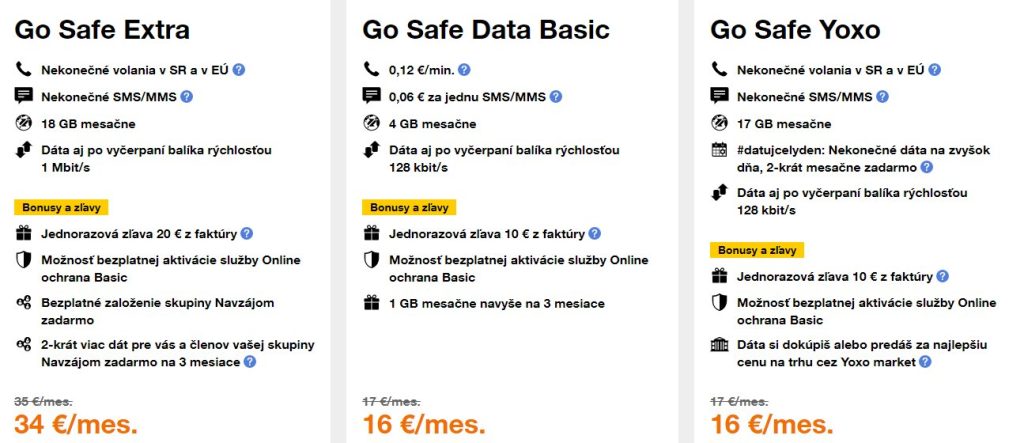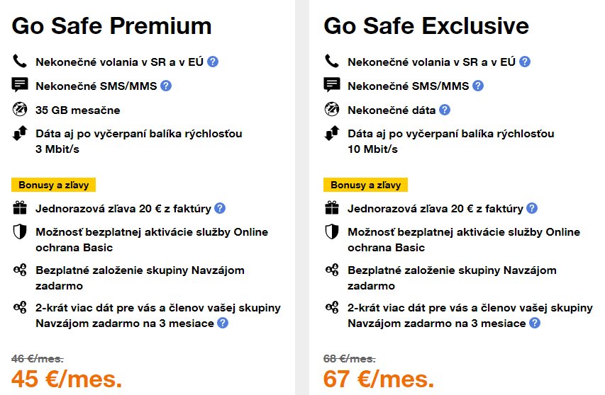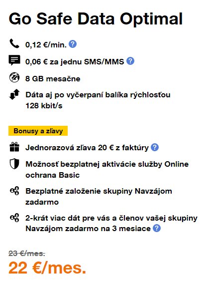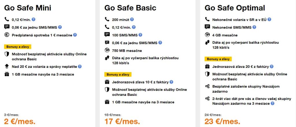 V prípade Orangeu v ponuke dátových paušálov je vidieť vyrovnanosť. Väčšina základných paušálov má v ponuke prenosové rýchlosť po prečerpaní dát plnou rýchlosťou na úrovni 128 kb/s. Táto rýchlosť postačuje iba na základné online operácie. Paušály zo stredu ponuky sú na tom lepšie. Ich prenosové rýchlosti sú na úrovni 1 – 3 Mb/s, zatiaľ čo vrcholom ponuky je paušál Go Safe Exkluziv, ktorý aj po prečerpaní dát ponúka prenosovú rýchlosť na úrovni 10 Mb/s. Viac už prezradí galéria nižšie.