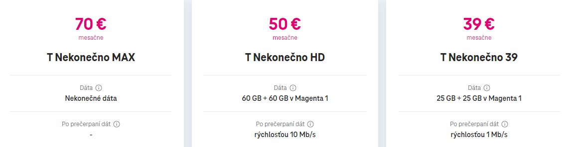 Pri paušáloch od Telekomu je ponuka iba mierne odlišná. V prípade, že predplatené dáta zo svojho paušálu miniete, tak v danom paušále surfujete aj naďalej, ale so zníženou rýchlosťou. Je potrebné si však dať pozor na jedno nastavenie. Pri vybraných paušáloch je potrebné aktivovať si balíček Vždy online, ktorý vám umožňuje surfovať donekonečna pri obmedzenej rýchlosti od 128 kb/s, a to po prečerpaní voľného objemu dát vo vašom paušále. Toto nastavenie vykonáte priamo v Telekom aplikácii.