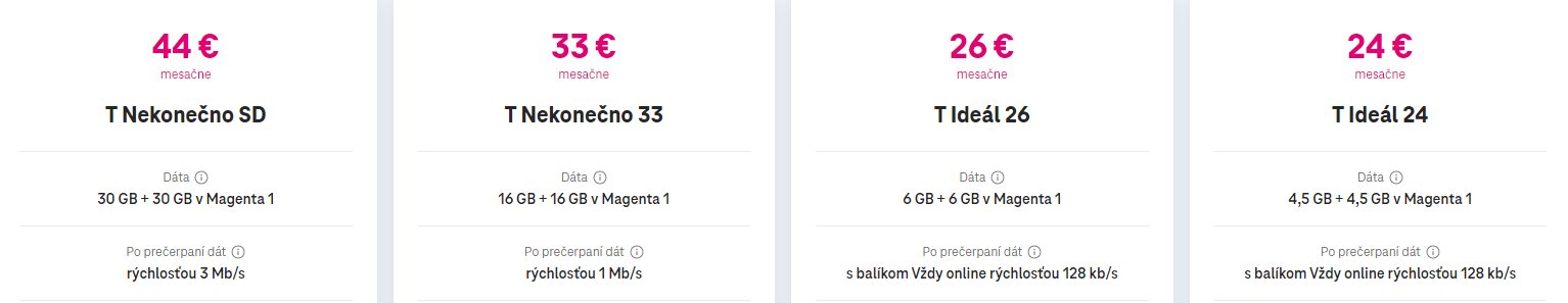 Pre paušály T Základ 12, T Základ 15, T Základ 18, T Dáta 18, T Ideál 21, T Ideál 22, T Dáta 22, T Ideál 24, T Ideál 26, T Dáta 26, T Ideál 28 je po prečerpaní voľného objemu dát potrebná dodatočná bezplatná aktivácia balíka Vždy online v Telekom aplikácii.