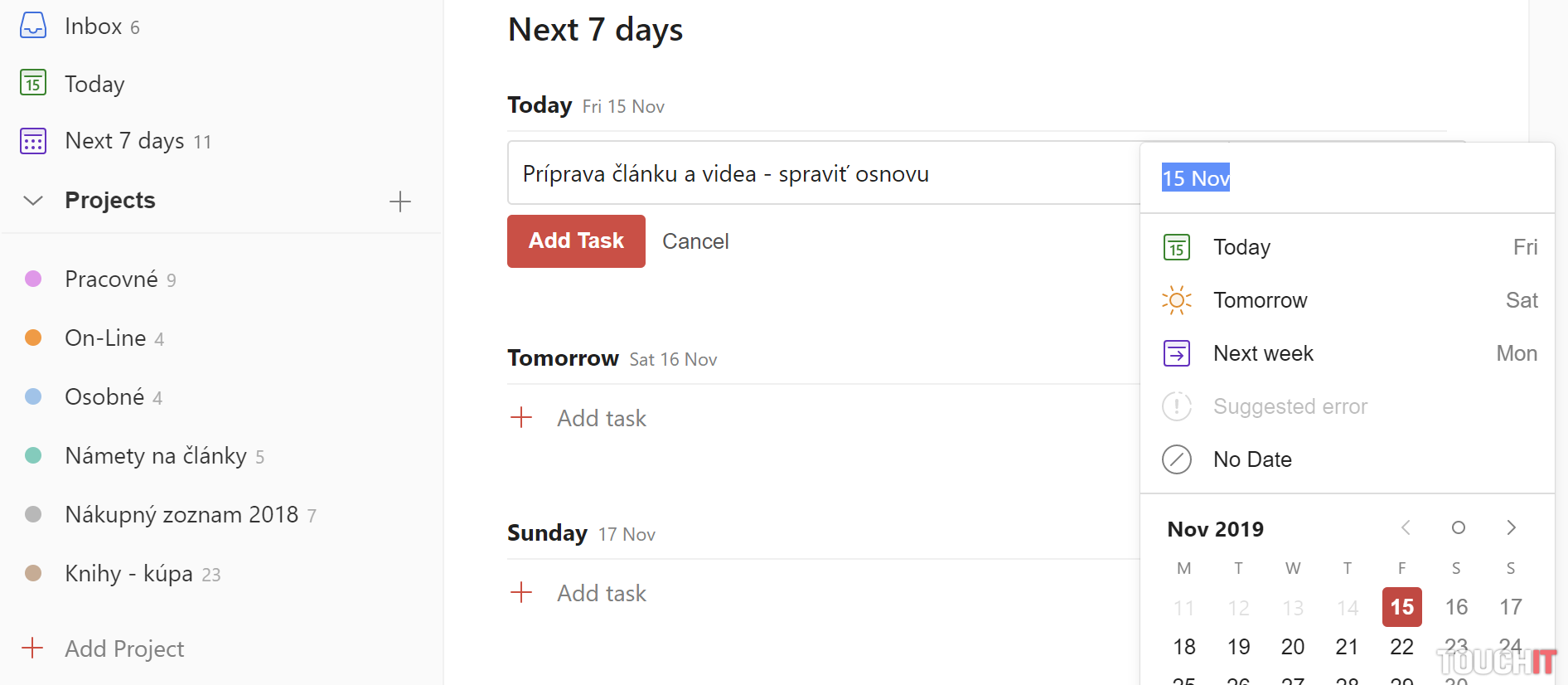 Nepotrebujem super premakané prostredie s možnosťami zameranými na komentovanie a priraďovanie úloh. Je to tu ale funkcie sú tak postavené, aby neprekážali. Zadanie úlohy, priradenie dátumu ak chcete, prípadne projektu. Projektom sa myslí zatriedenie, aby bolo vidno, či ide o pracovné veci, dovolenku alebo nejakú záľubu. No a nechýba trojstupňové definovanie priority.