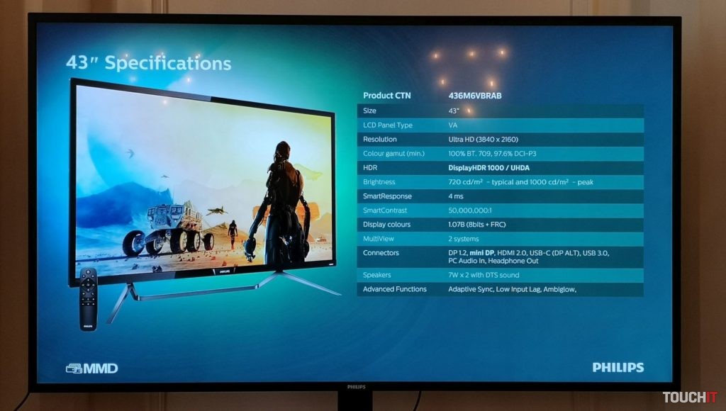 Philips Momentum 436M6VBPAB tiež možnože v niektorých domácnostiach nahradí aj televízor – kvalitu zážitku zo sledovania filmov či seriálov a porovnanie s klasickým televízorom však budeme musieť najskôr otestovať v redakcii. Monitor však v tomto smere poteší dvoma pomerne kvalitnými 7 W stereo reproduktormi a podsvietením spodného rámčeka okolo displeja. V balení je aj jednoduchý diaľkový ovládač a monitor podporuje funkciu HDMI-CEC pre ovládanie pripojených zariadení. Novinka sa dostane do predaja koncom mája za 799 eur. Monitor bude dostupný aj v iných uhlopriečkach, detaily budú oznámené počas budúceho mesiaca. Mali by sme sa dočkať aj väčšej uhlopriečky, pričom MMD chce udržať cenu pod hranicou 1000 eur.
