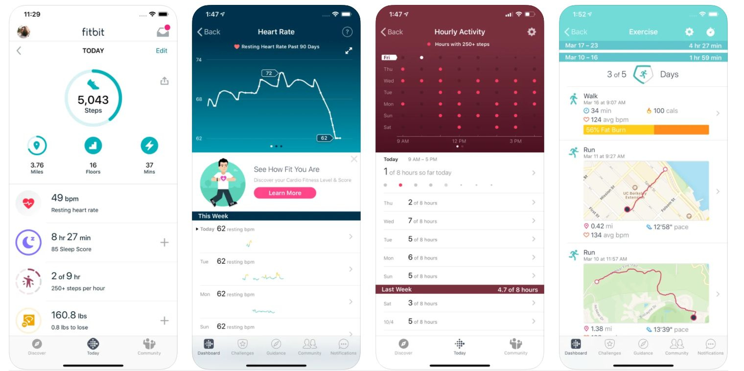 Fitbit má efektné a moderné používateľské rozhranie. Aplikácia kladie veľký dôraz na analýzu spánku a stresu, okrem toho ponúka prehľadné podanie ostatných všeobecných informácií o zdraví. Súčasťou aplikácie sú rôzne tréningy a návody, ako správne meditovať. Fitbit tiež ponúka vlastnú sociálnu minisieť, ktorá je zameraná na fitness.