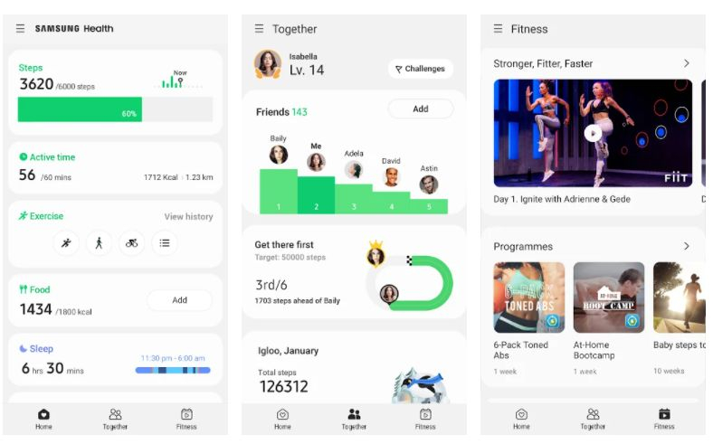 Samsung Health je aplikácia pre fitness náramky a inteligentné hodinky od Samsungu. Má moderný a prehľadný dizajn a ponúka funkcionalitu na vysokej úrovni. Kvalitatívne je na úrovni aplikácie Fitbit, a to z hľadiska zobrazovania všeobecných informácií o vašom zdravotnom stave a tiež aj vďaka zakomponovanej funkcii, ktorá umožňuje zvoliť si tréningový plán – napríklad aj na cvičenie doma. K dispozícii sú tiež návody na meditáciu.