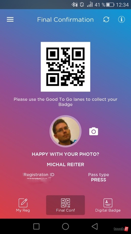 Digitálny „pre-badge“. Ten skutočný dostanete ná základe tohto a pasu alebo OP na letisku alebo priamo na výstavisku, či napríklad niektorej z vlakových staníc v Barcelone
