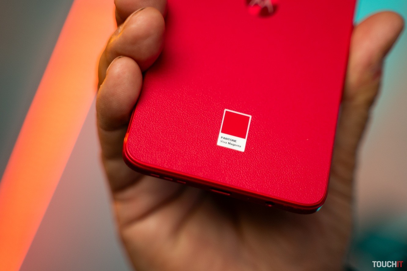 Telefón sme mali vo farbe Pantone Viva Magenta, na zadnej časti je štruktúrovaný povrch z vegánskej kože. Veľmi dobre sa tento telefón drží v ruke, dané je to aj jeho optimálnou veľkosťou. Odolnosť voči prostrediu je IP54, telefón sa určite nezľakne dažďa.