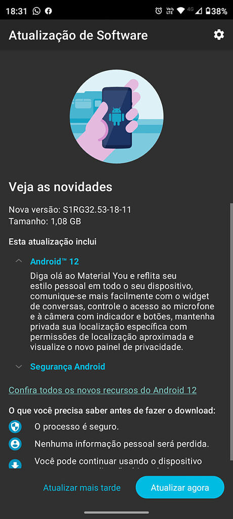 V prípade brazílskej aktualizácie má inštalačný súbor označenie ako S1RG32.53-18-11 a veľkosť 1,08 GB. Je menší, ako býva zvykom napríklad na smartfónoch Samsung. To je však aj tým, že Motorola používa čistejšiu verziu systému. Nie že by bola úplne čistá, ako v prípade Nokií. Výrobca už dlho pridáva užitočné nastavenia ako napríklad doplnky Moto a najnovšie posledné roky aj rozhranie My UX.