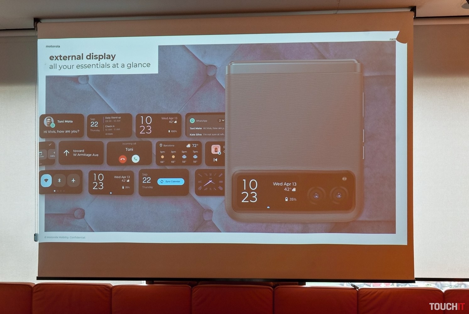 Motorola pri tomto telefóne výrazne rozšírila možnosti externého displeja, takže môžete robiť viac so zatvoreným zariadením. Samozrejmosťou je odpovedanie na správy, preberanie prichádzajúceho hovoru, odpovedanie na správy na sociálnych sieťach a pod.
