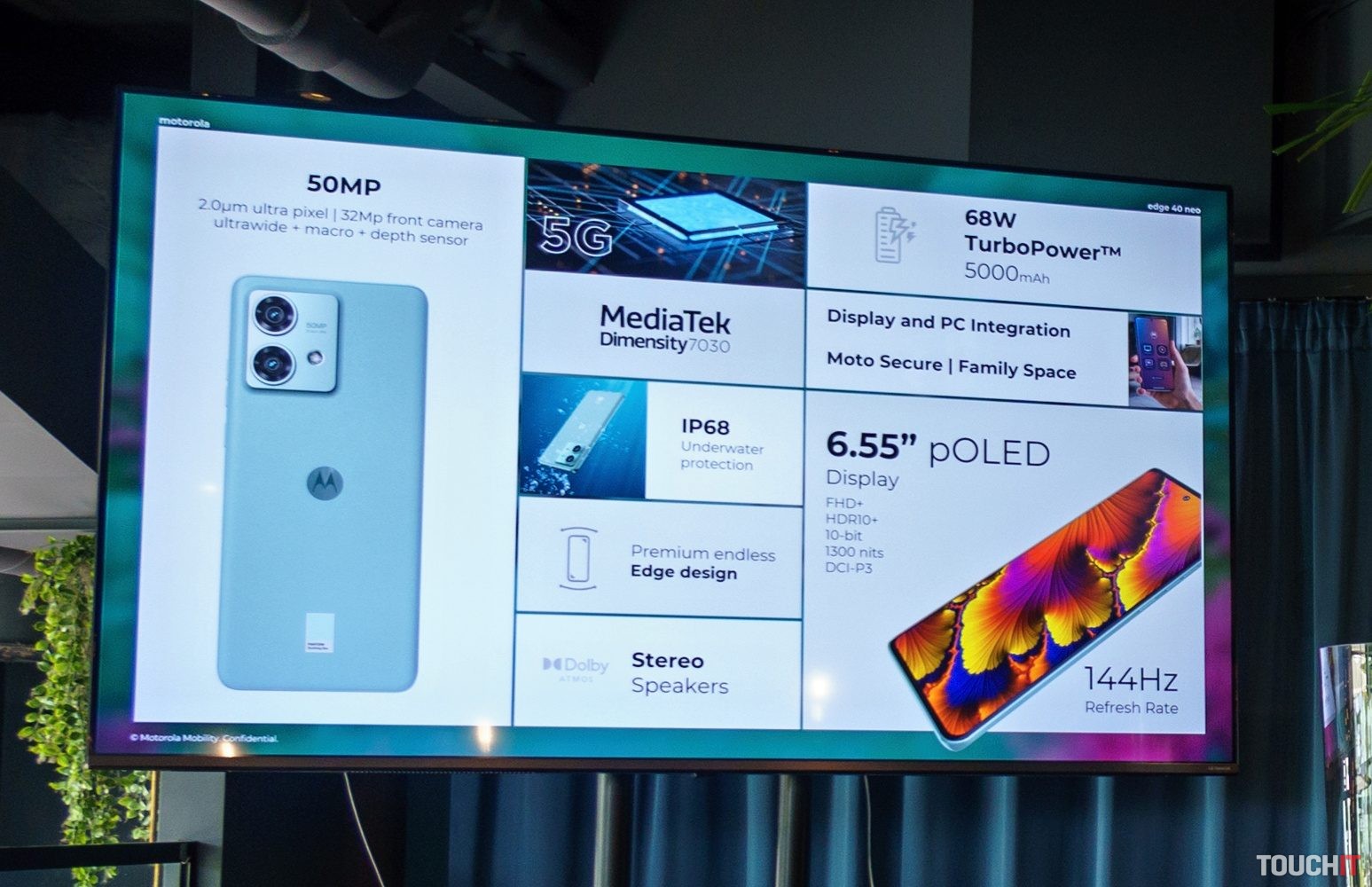 Ďalej je tu 6,5-palcový pOLED displej s podporou HDR10+, rozlíšením FHD+, frekvenciou 144 Hz a svietivosťou 1300 nitov. Certifikáciu DOlby Vision napr. pre Netflix však telefón nepodporuje. Procesorom je MediaTek Density 7030, je to 5G telefón s podporou Wi-Fi 6E. Podstatná je ale kapacita pamäte 12 GB a 256 GB priestoru pre používateľa. Podľa Motoroly je 12 GB nový štandard kapacity RAM na Slovensku. Veríme, že si to osvoja aj ďalšie značky smartfónov v našej krajine.