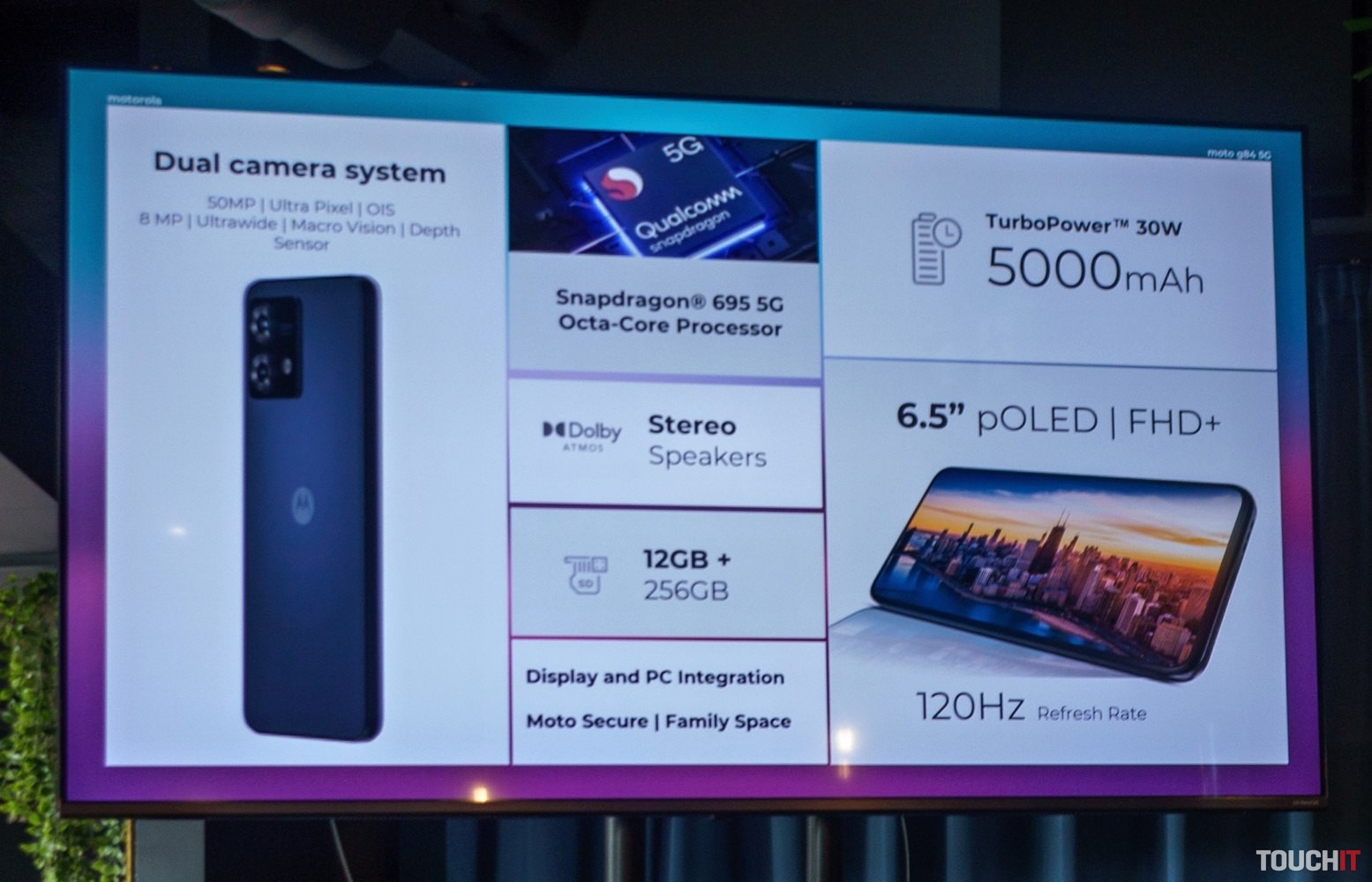 Hlavná kamera má 50 Mpx a je s optickou stabilizáciou. K tomu je ultraširokouhlá kamera a snímač hĺbky. Špecialitou je priestorový zvuk. Certifikácia voči prachu a vode je IP54. Kapacita batérie je opäť 5000 mAh, súčasťou dodávky je 30 W nabíjačka a obal na telefón. Procesor je Snapdragon 695, telefón opäť podporuje aj eSIM a tiež Ready For.