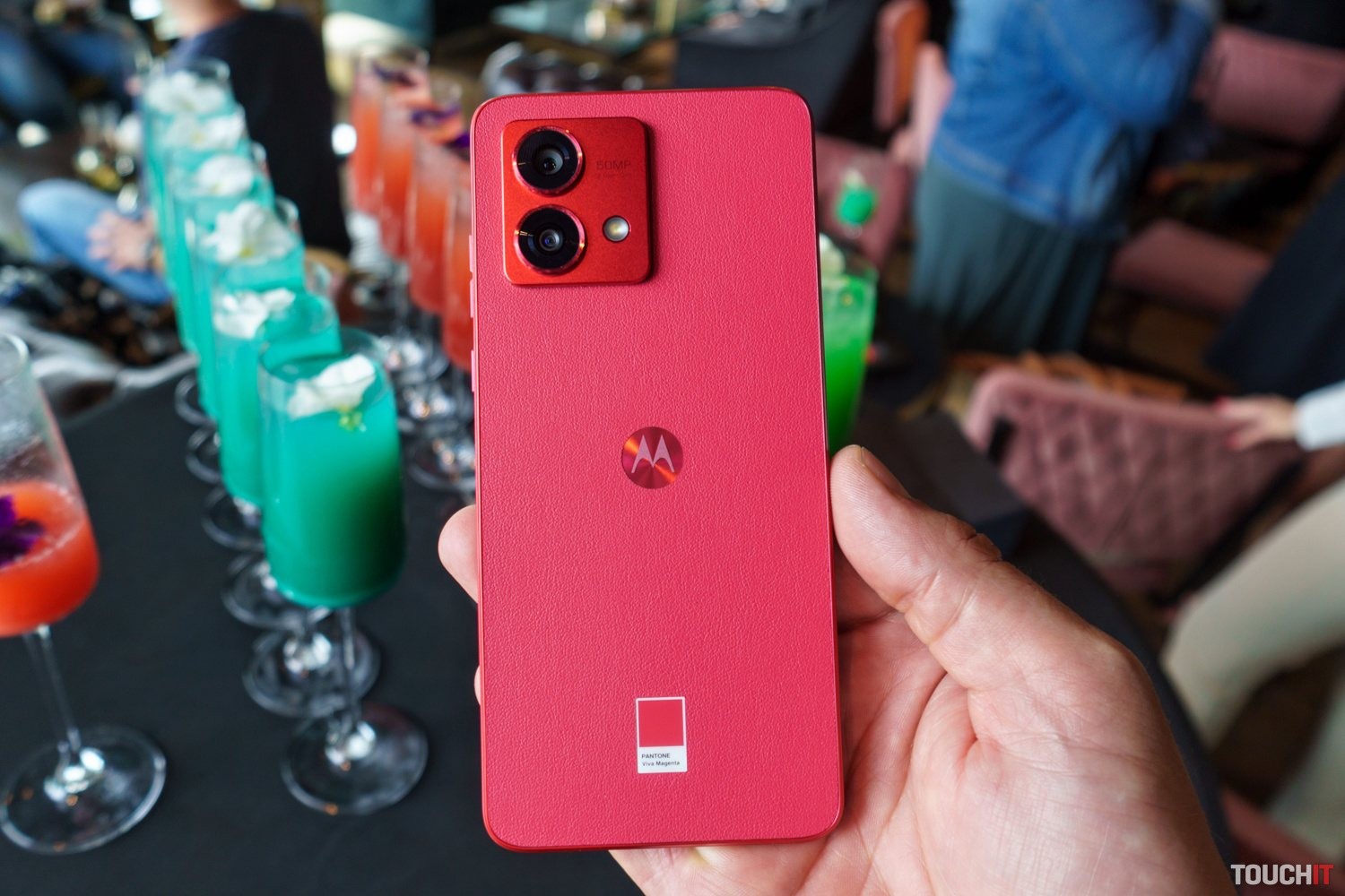 Ďalší z telefónov je Motorola moto g84 5G. Je to telefón s cenovkou 299 eur, čo patrí na Slovensku k najpredávanejším modelom. Má hmotnosť 167 gramov, prichádza v troch farbách a aj tu je model s farebnou certifikáciou Pantone. Konkrétne je to farba Viva Magenta. Konštatujeme, že telefón vyzerá prémiovo, vôbec nepripomína cenovku pod 300 eur.