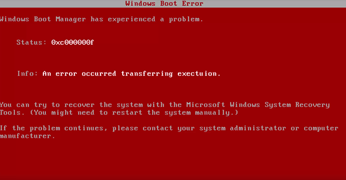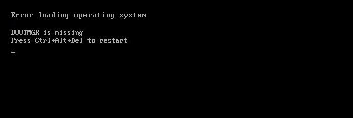 Reálna červená podoba inak na čiernom pozadí zobrazenej chyby Boot manažéra v testovacích zostaveniach Windows Vista