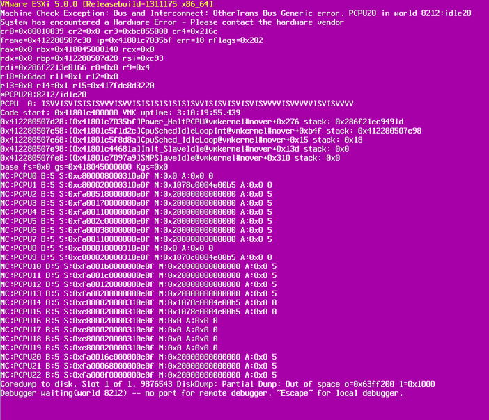 Ak VMkernel takéhoto systému zaznamená fatálne zlyhanie, vypne všetky virtuálne stroje a zobrazí fialovú obrazovku smrti s popisom problému.
