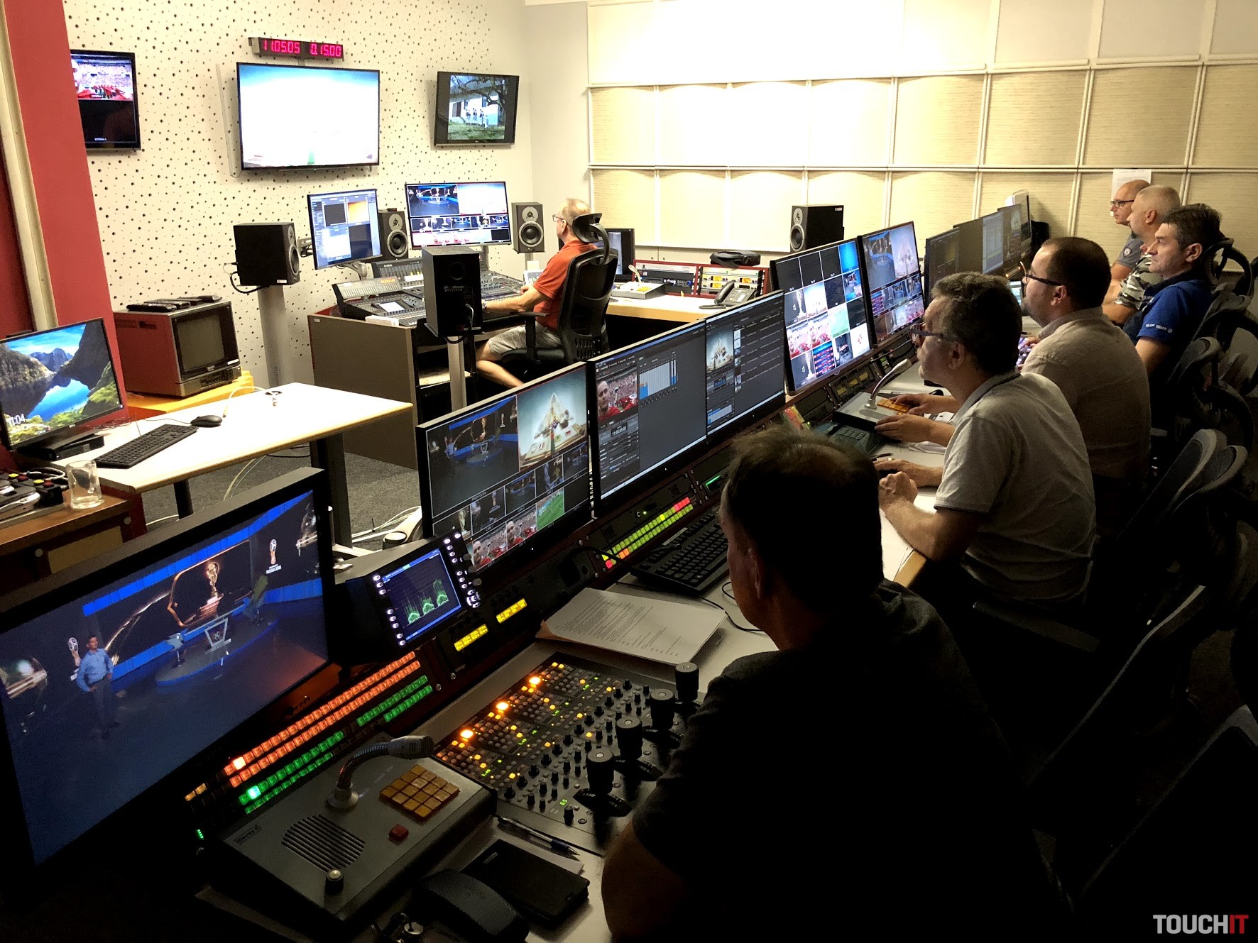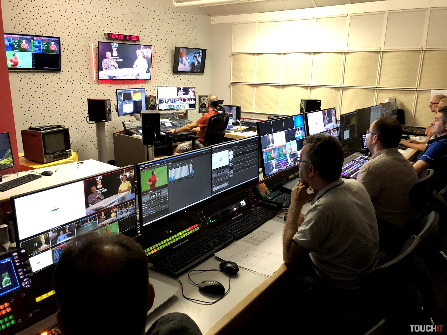 Pohľad do štúdia, na virtuálnu grafiku a tiež aj do zákulisia v réžii, kde na živé prenosy dohliada necelá desiatka pracovníkov