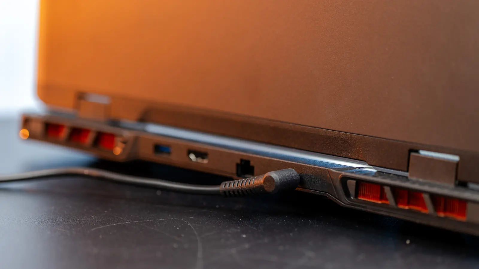 Notebook tiež obsahuje HDMI 2.1 výstup na zadnej hrane, ethernet a napájací port. Wi-Fi konektivita je vo verzii 6E. Port na napájanie má dostatočný odstup od ostatných portov, takže neobmedzuje prístup k ethernetu ani k výduchom.
