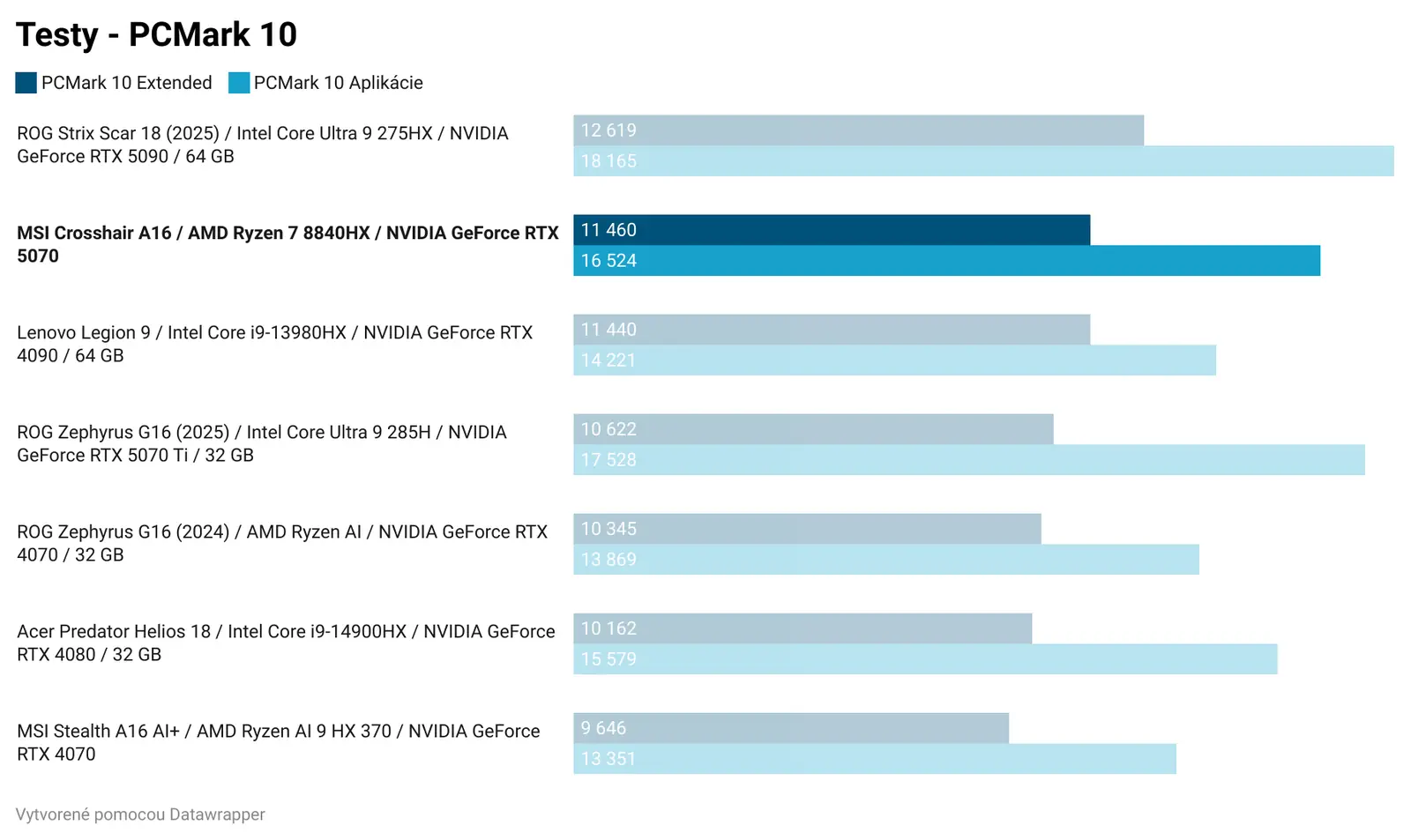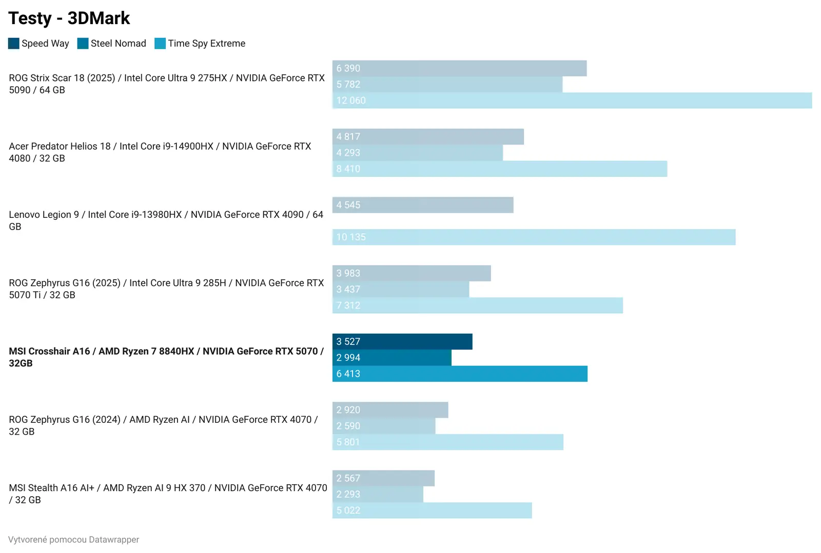 MSI Crosshair A16 HX D8W dokáže fungovať s maximálnym tepelným výkonom na úrovni 170 W a tepelným grafickým výkonom na úrovni 115 W. Výsledky v 3DMark dopadli podľa očakávania. Grafický čip prináša o 20 % vyšší surový výkon ako RTX 4070. Za výkonnejšou kartou RTX 5070 Ti zaostáva o cca 10 %.