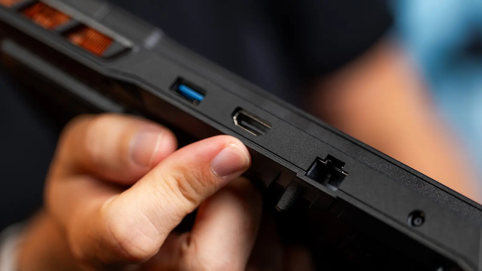 Porty sú rozložené po troch stranách. Vľavo je USB-C 3.2 Gen2 s podporou prenosu obrazu aj napájania. Tento port som využíval na nabíjanie na cestách, keď som sa na notebooku nepotreboval hrať. Vedľa neho je USB port typu 3.2 Gen2. Ďalšie USB porty sú vľavo a na zadnej hrane. Celkovo sú tri.