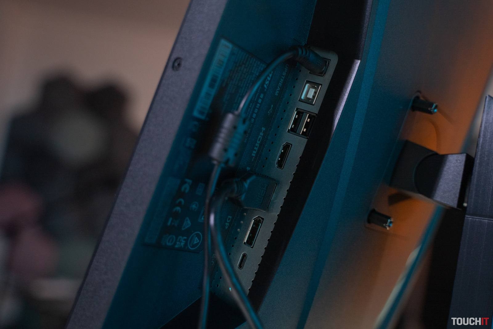 V portovej výbave sa nachádza 2× HDMI (podporuje UHD@144Hz podľa špecifikácie HDMI 2.1), 1× DisplayPort (podporuje UHD@144Hz podľa špecifikácie DisplayPort 1.4a), 1× USB Type-C (DP alt. s PD nabíjaním 65 W), 2 × USB 2.0 typ A, 1 × USB 2.0 typ B a 1 × 3,5 mm výstup na slúchadlá alebo externé reproduktory, keďže vo výbave sa tie zabudované nenachádzajú. Za zmienku stojí aj pomerne veľký 19 V (6.32A) napájací adaptér, ktorý si na stole rozhodne všimnete, pokiaľ ho dômyselne neskryjete.