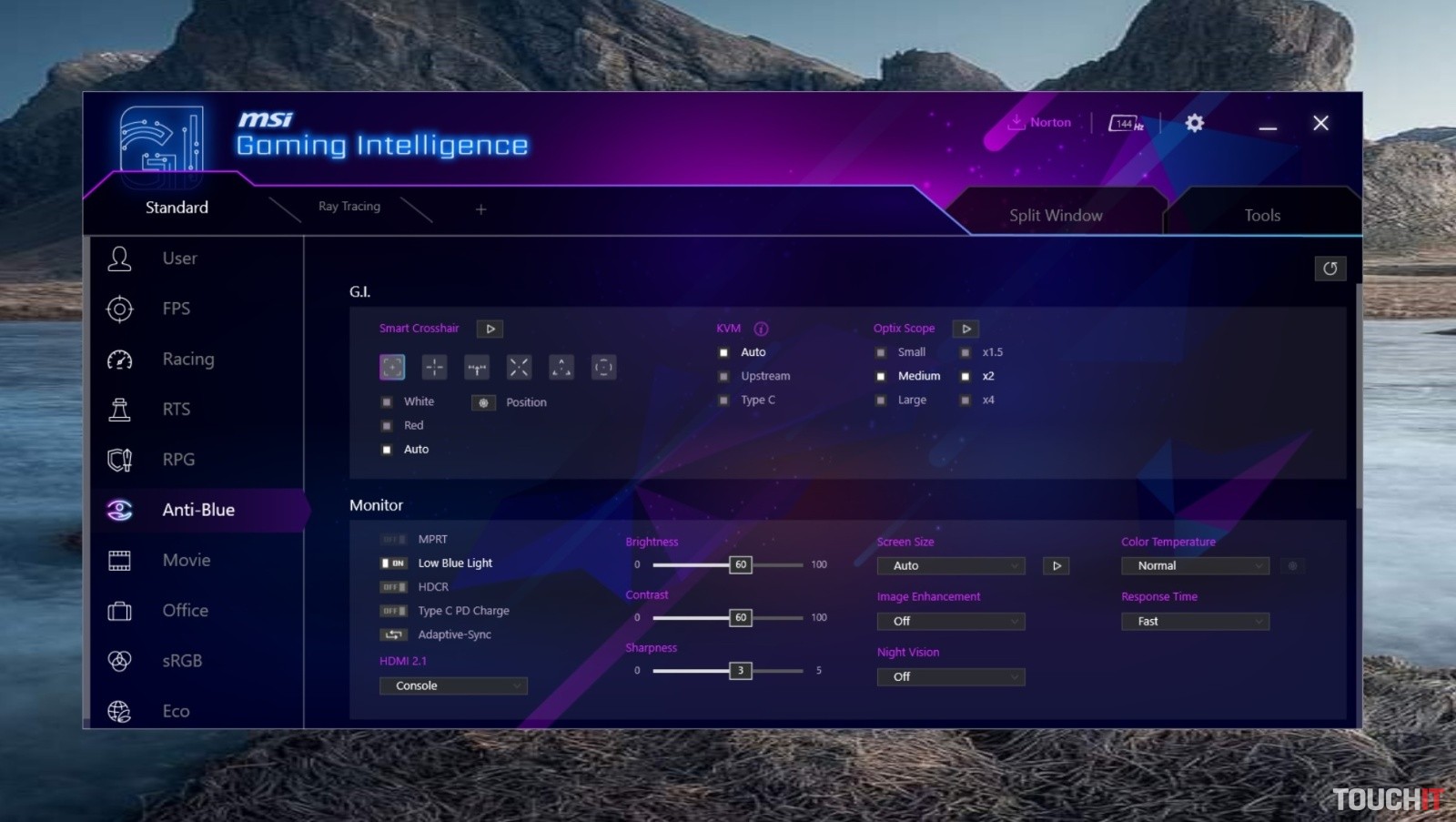 Nastavenie herných, ale aj bežných režimov, je skutočne veľmi detailné, avšak tieto možnosti môžu byť veľkým sústom aj pre intuitívne nastavenie pomocou joysticku. Práve v tomto bode nastupuje Gaming Intelligence. Je to softvér od MSI, ktorý umožňuje rýchle nastavenie obrazovky pomocou myši a nahradiť tak zdĺhavé nastavovanie cez ponuku monitora. Tento softvér integroval mnoho funkcií vrátane monitorovania hier, popisov v hrách, súborov s nastaveniami hier, systémových nastavení, klávesových skratiek, ovládania joystickov a ďalších doplnkových funkcií, ako je realizácia obrazu v obraze na monitoroch MSI atď.